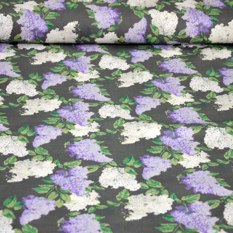 Description Tissu en coton au mètre, 125 g/m², largeur 160 cm, imprimé à lilas gris sur fond graphite