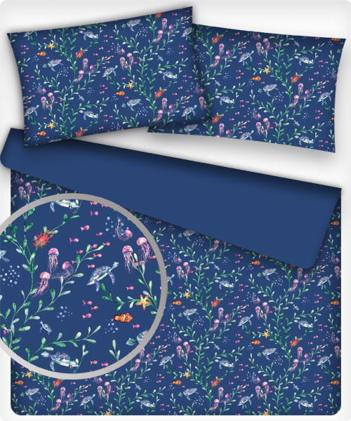 Description Tissu coton au métre imprimé Monde de l’eau grenat