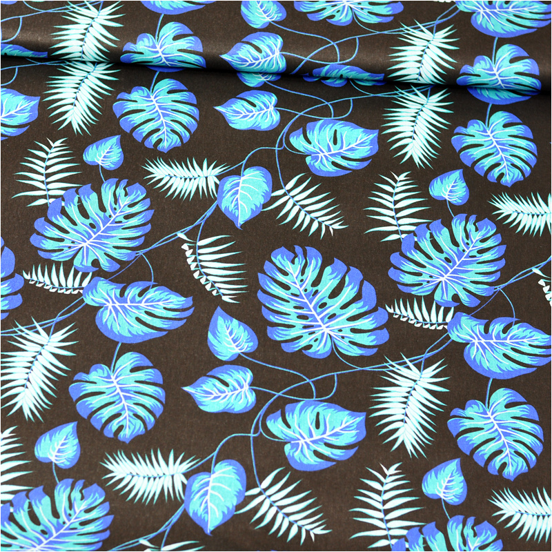 Description Tissu en coton au mètre, 125 g/m², largeur 160 cm, imprimé à palmes bleues sur fond noir