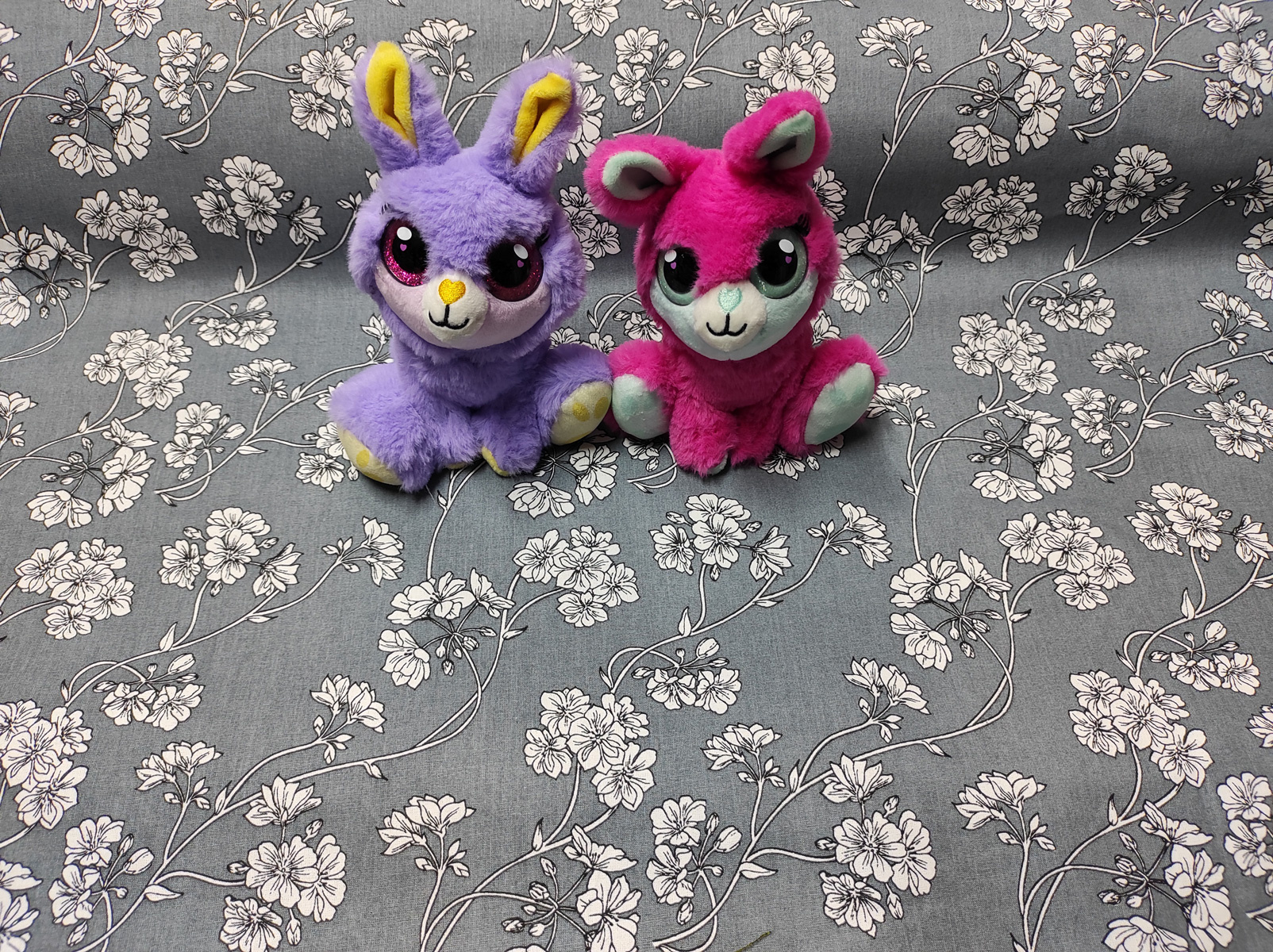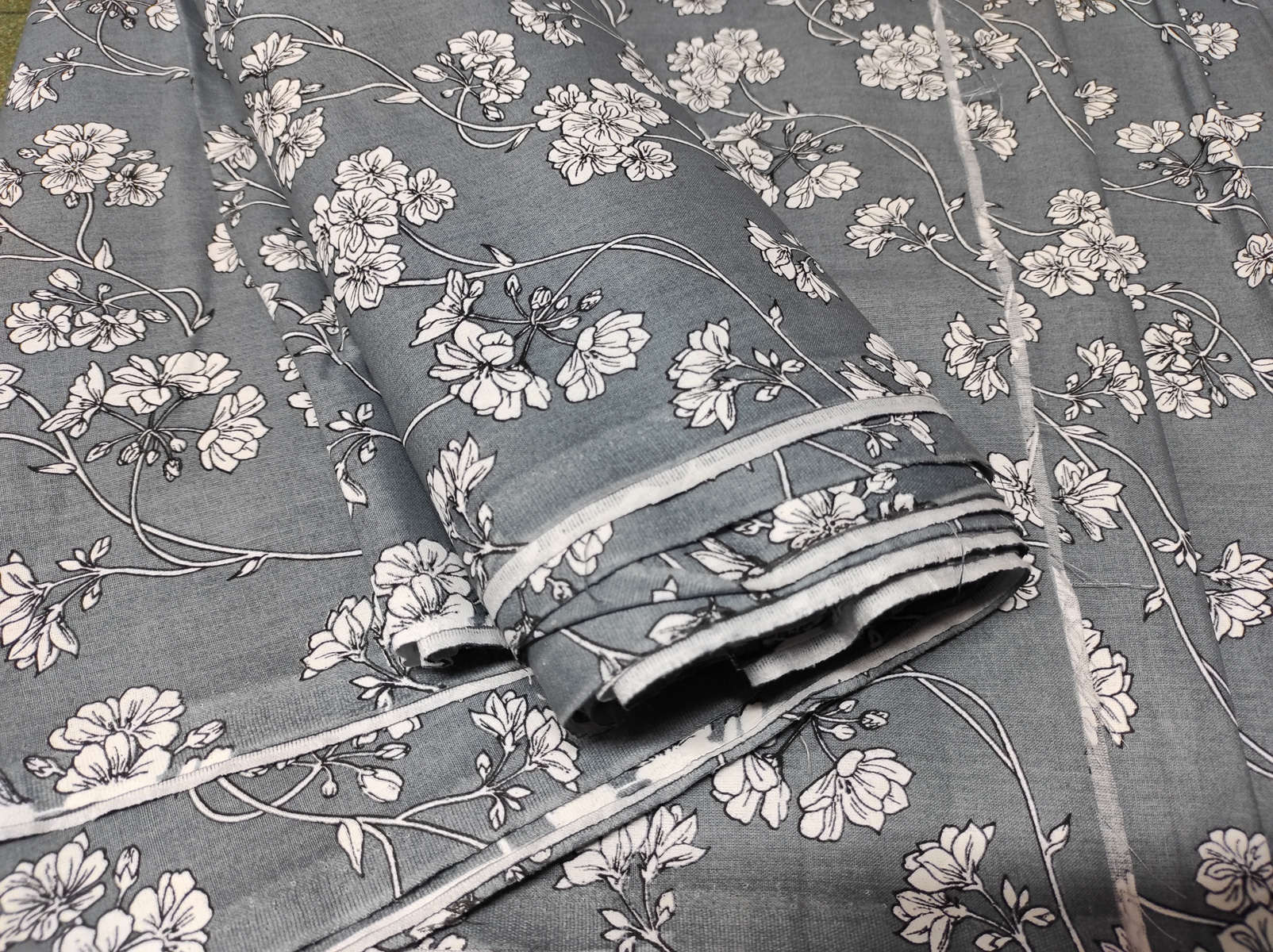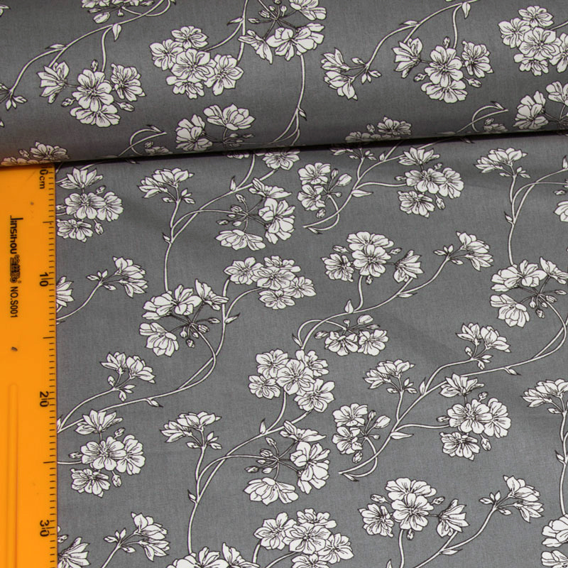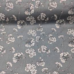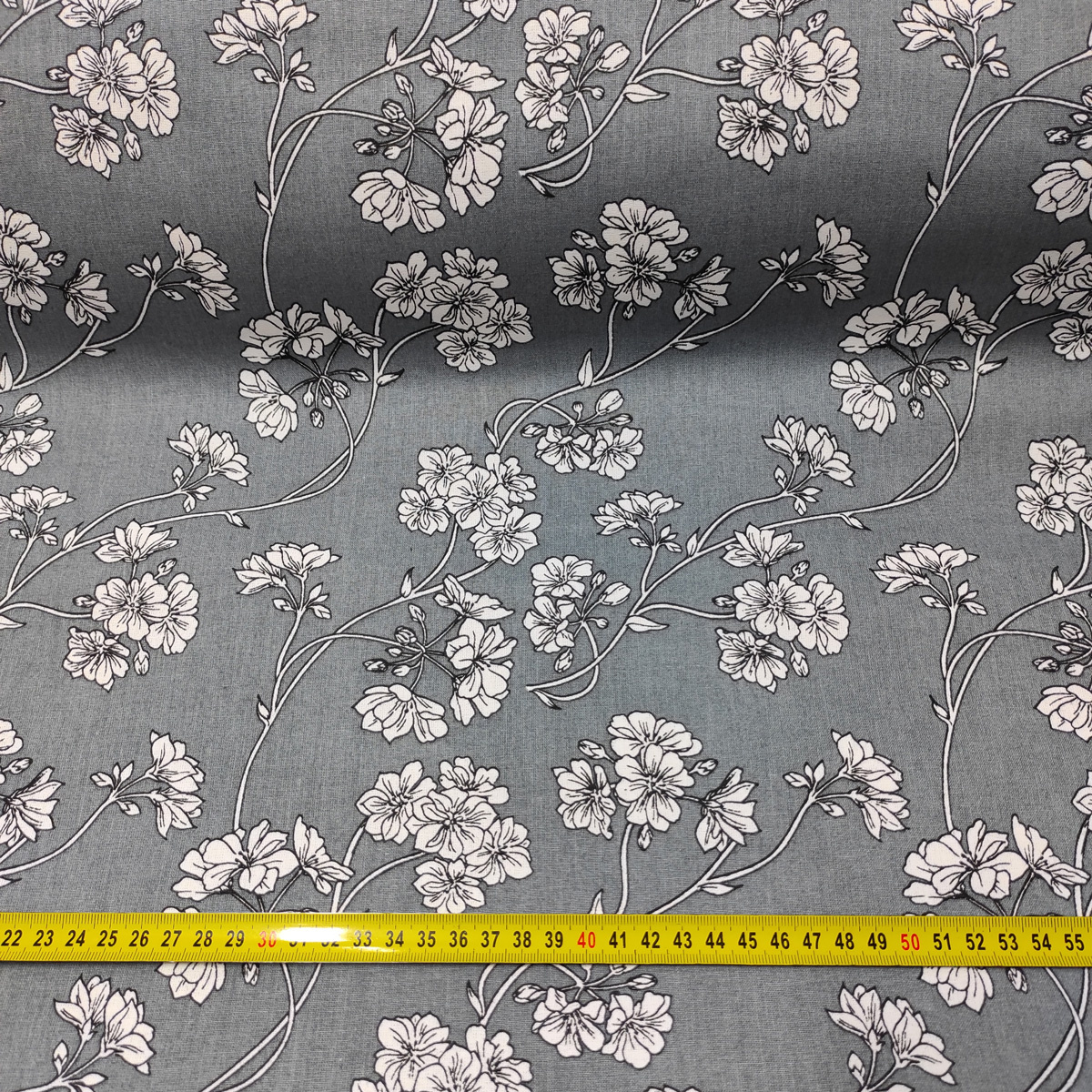 Description Tissu en coton au mètre, 125 g/m², largeur 160 cm, imprimé à fleurs sur fond gris