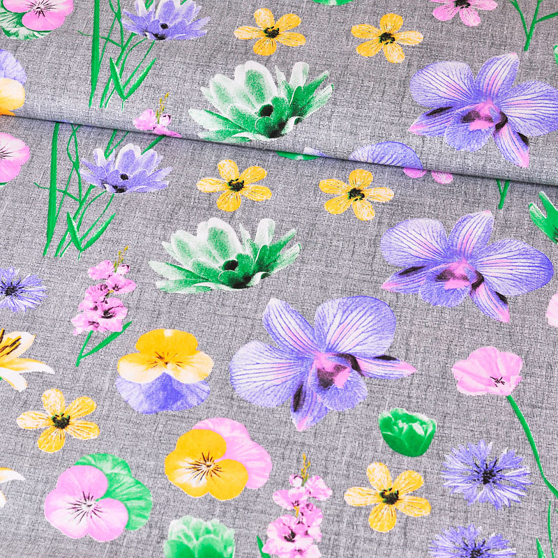 Description Tissu en coton au mètre, 125 g/m², largeur 160 cm, imprimé à lis sur fond gris
