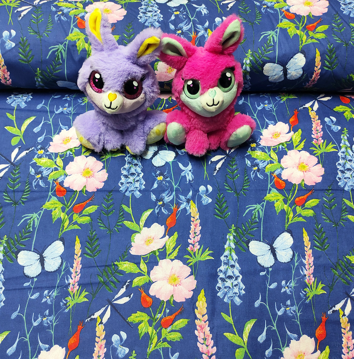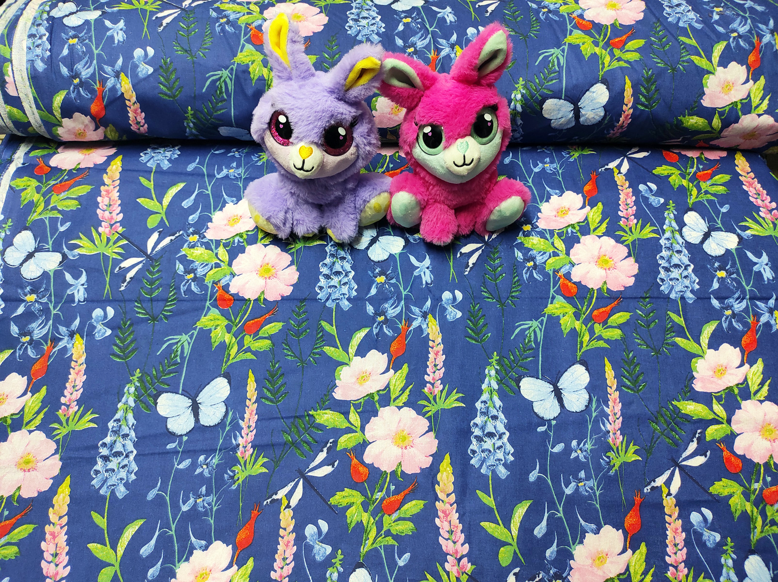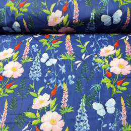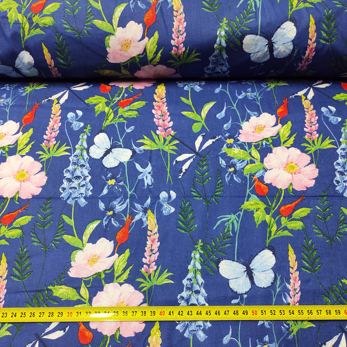 Description Tissu en coton au mètre, 125 g/m², largeur 160 cm, imprimé à fleurs champ sur fond bleu