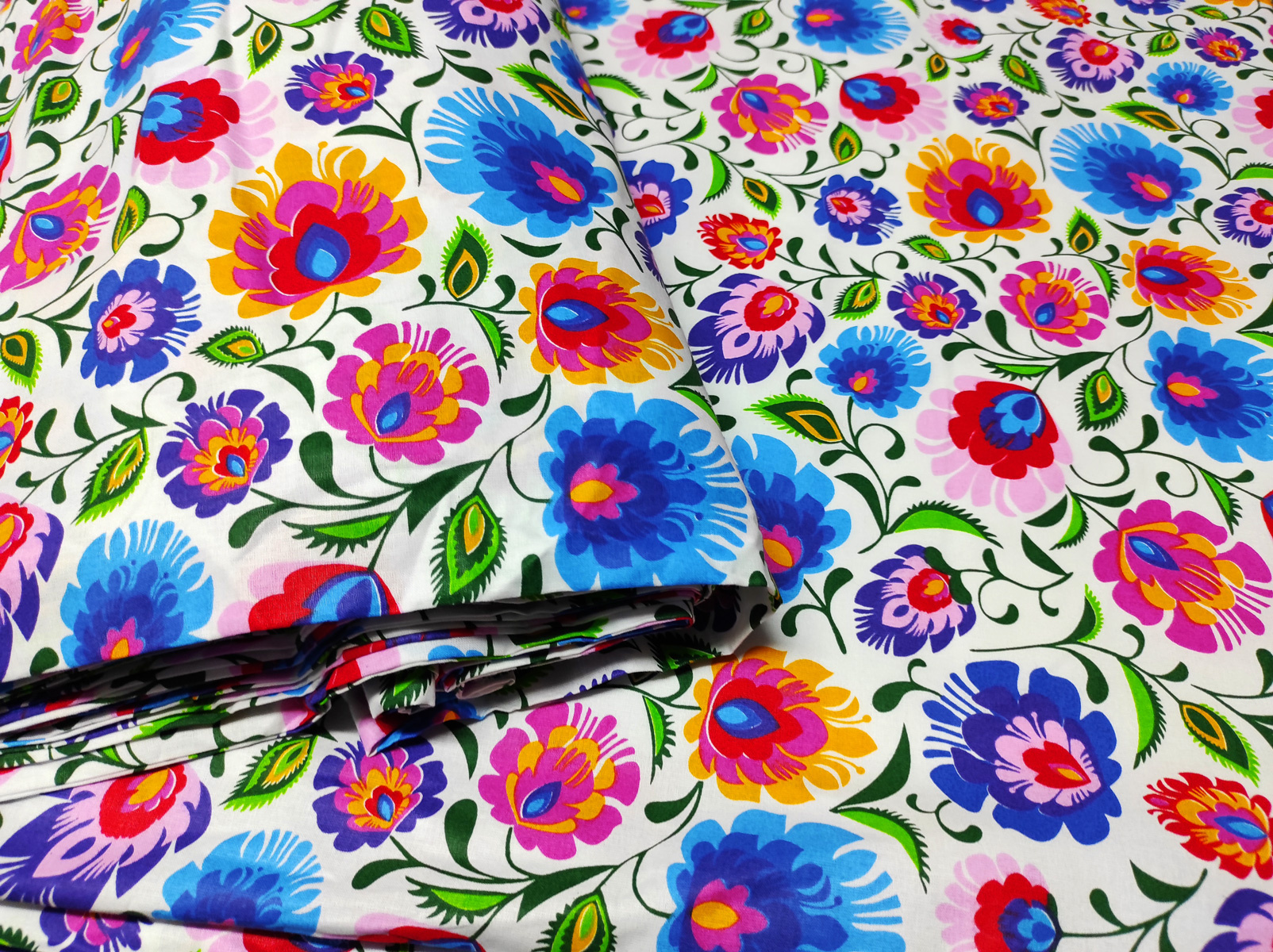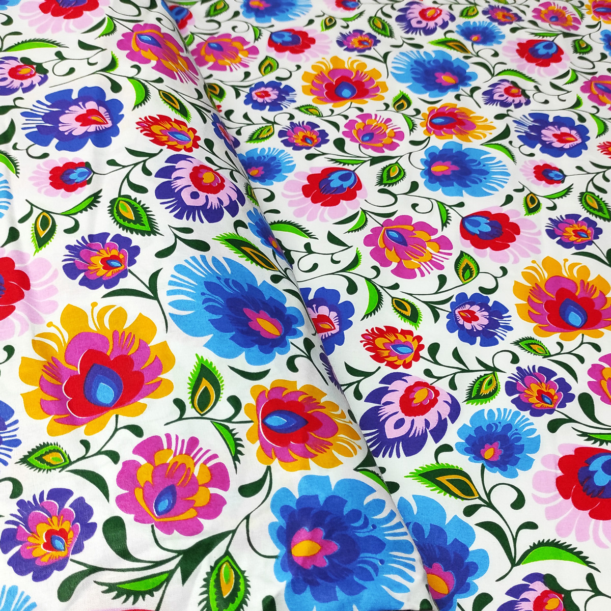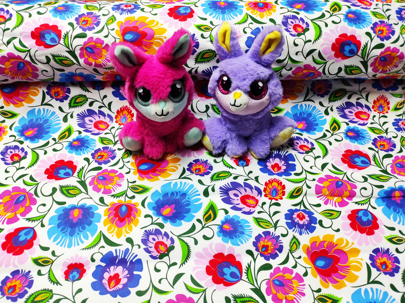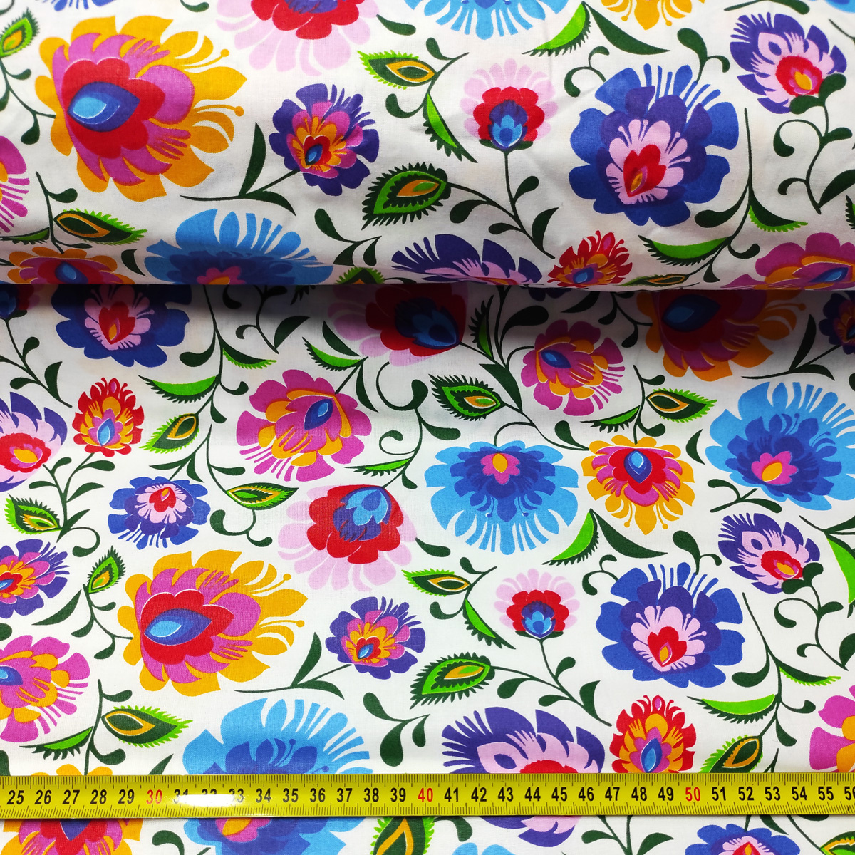 Description Tissu en coton au mètre, 125 g/m², largeur 160 cm, imprimé à fleurs colorées blanc