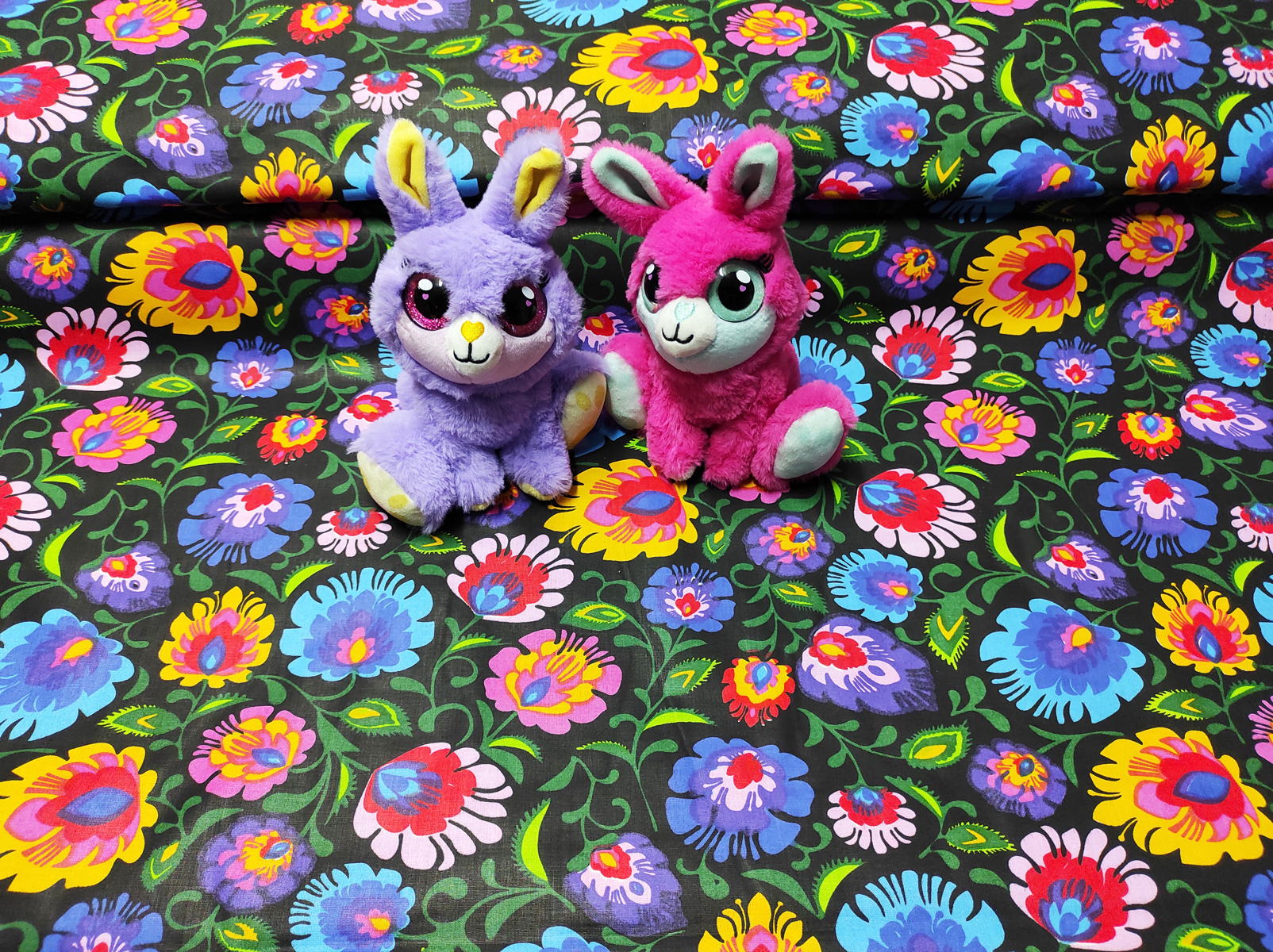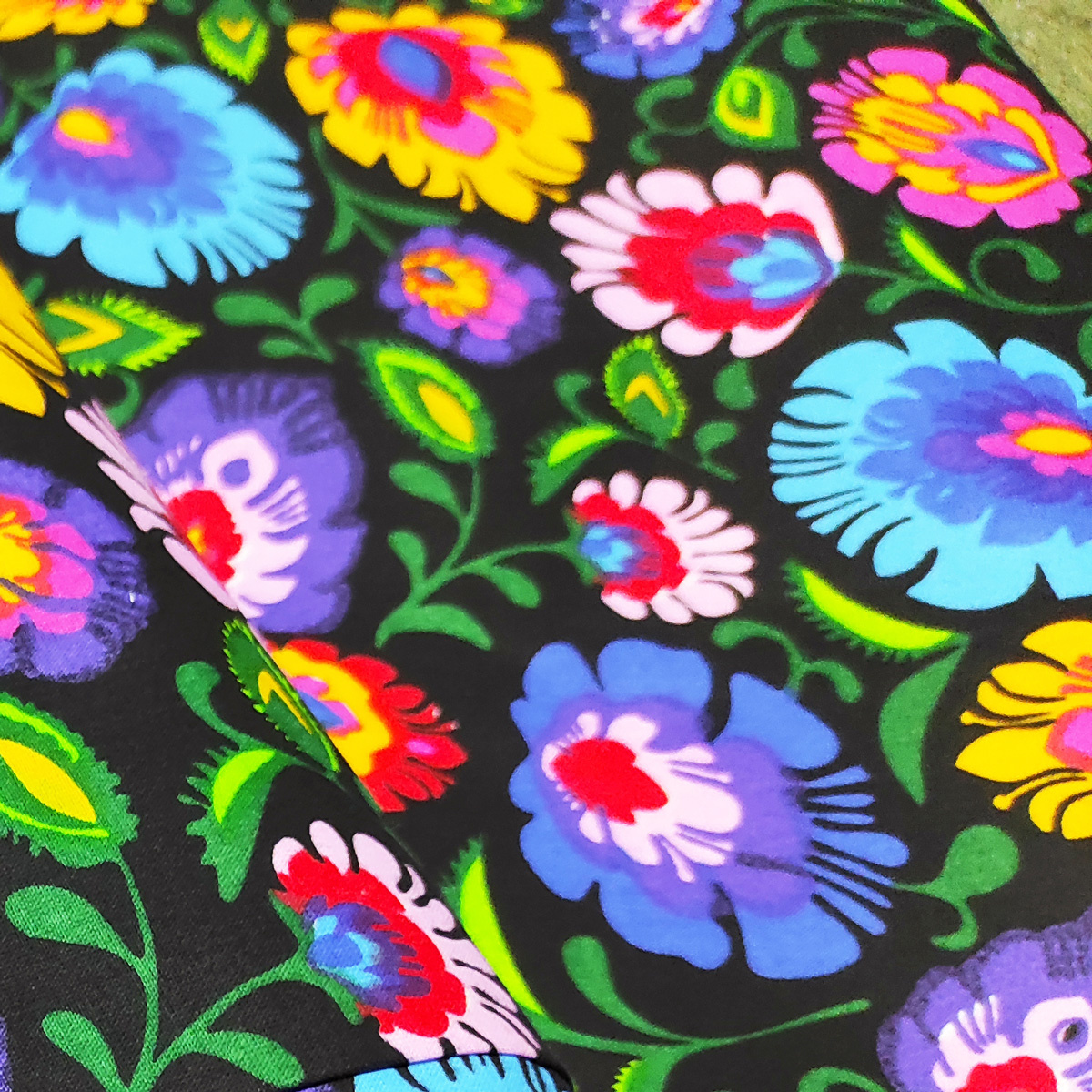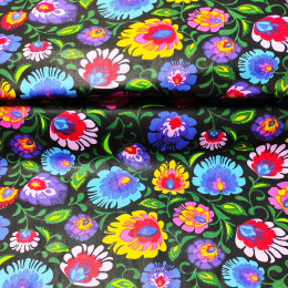 Description Tissu en coton au mètre, 125 g/m², largeur 160 cm, imprimé à fleurs colorées noirs