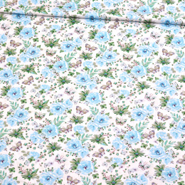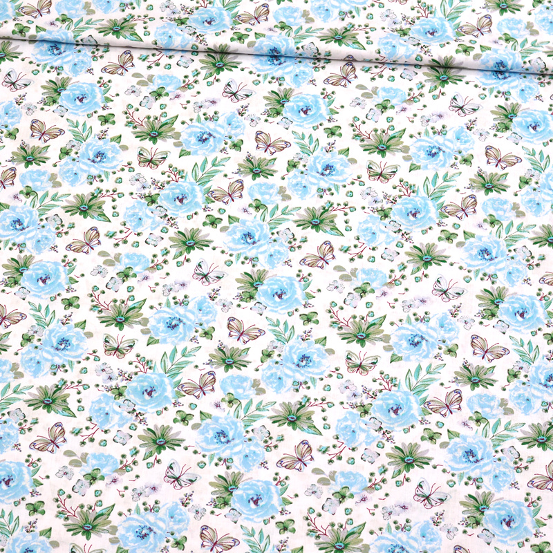 Description Tissu en coton au mètre, 125 g/m², largeur 160 cm, imprimé à fleurs petites bleu sur fond blanc