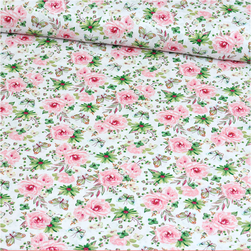 Description Tissu en coton au mètre, 125 g/m², largeur 160 cm, imprimé à fleurs petites rose sur fond blanc