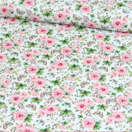 Tissu en coton au mètre, 125 g/m², largeur 160 cm, imprimé à fleurs petites rose sur fond blanc