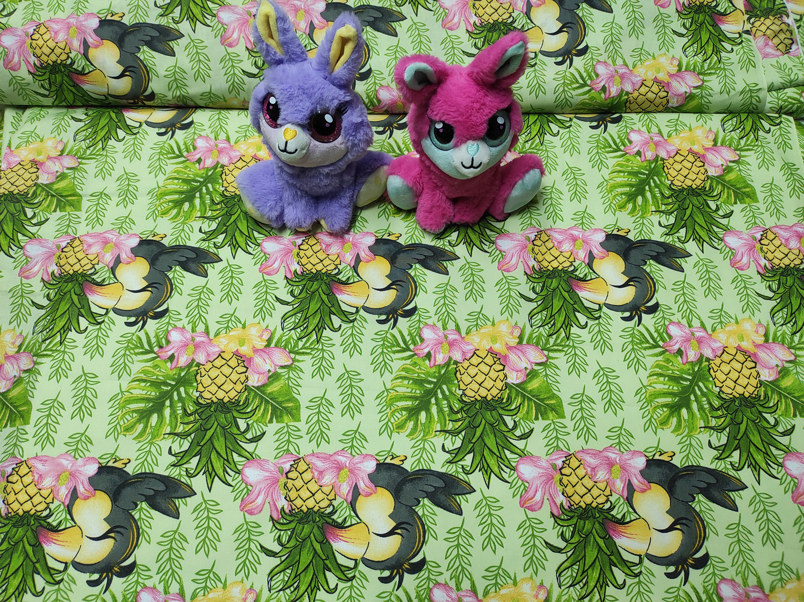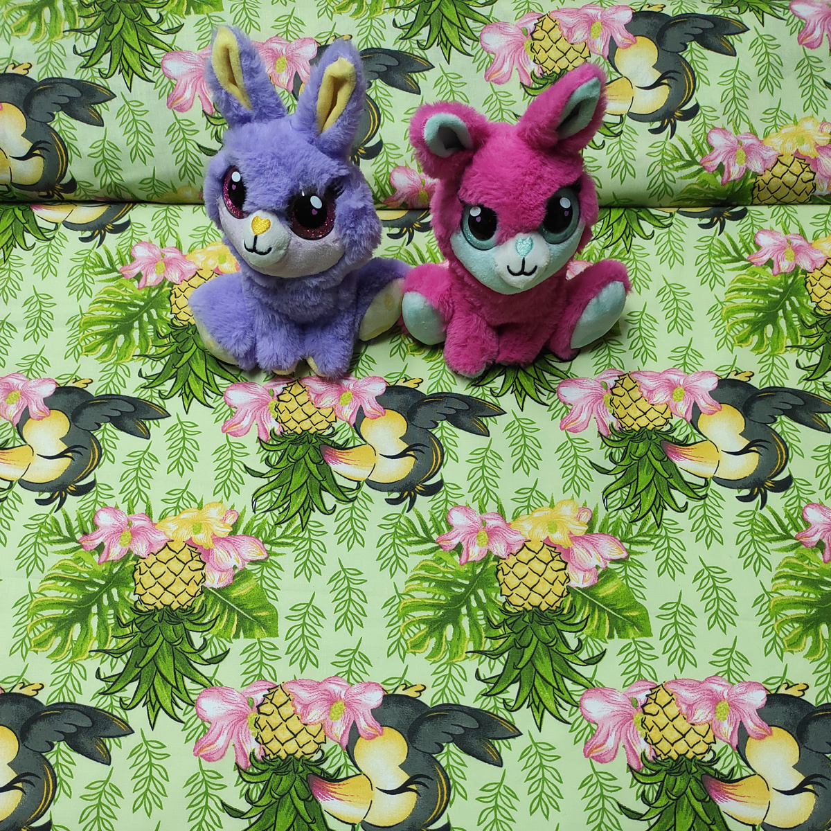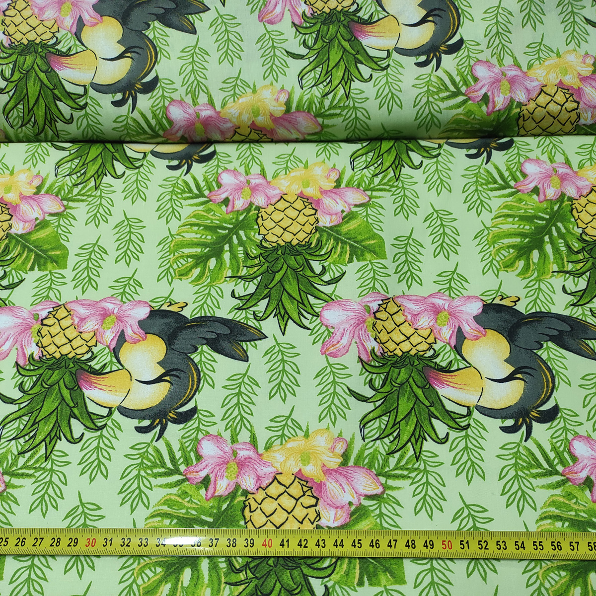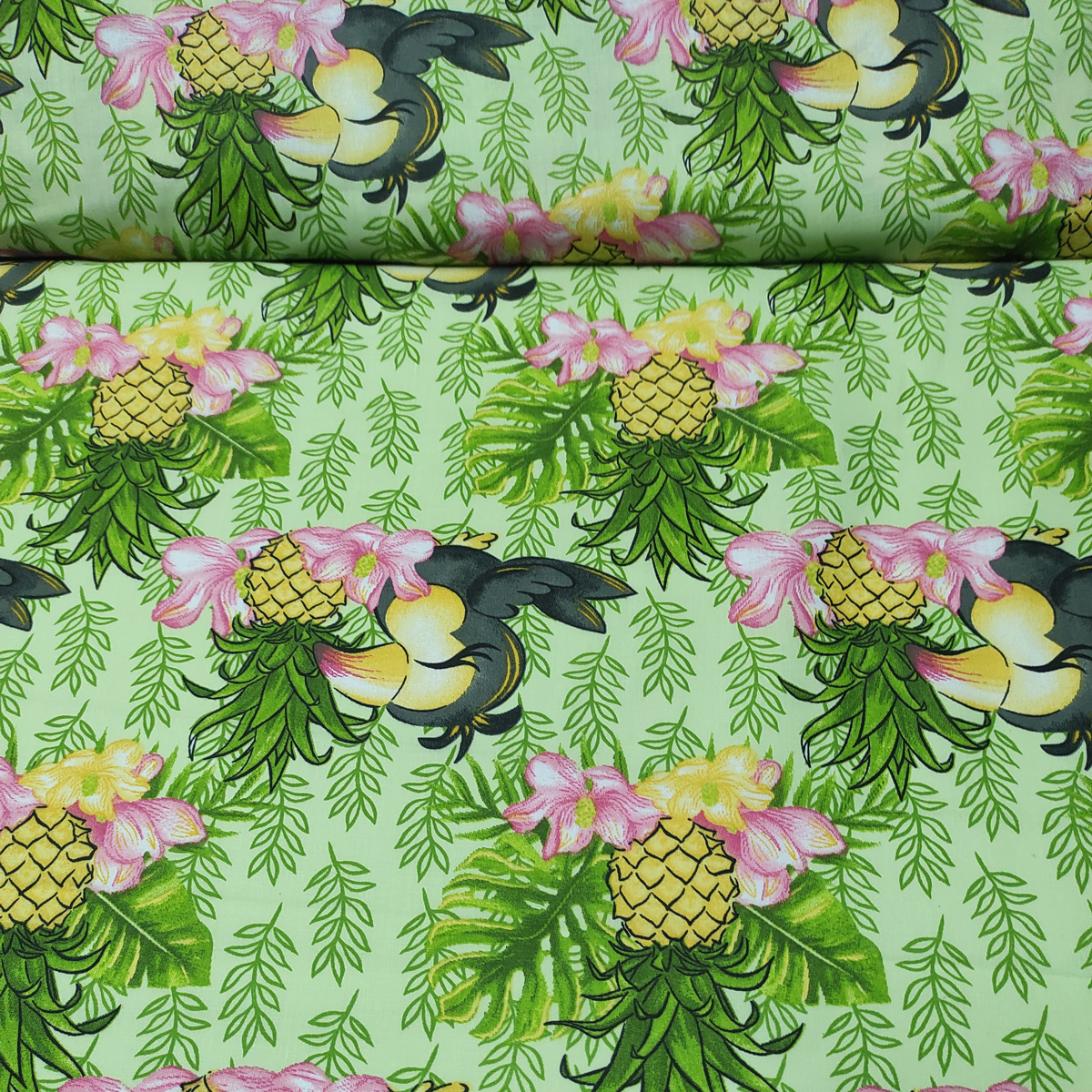 Description Tissu en coton au mètre, 125 g/m², largeur 160 cm, imprimé à ananas sur fond verte