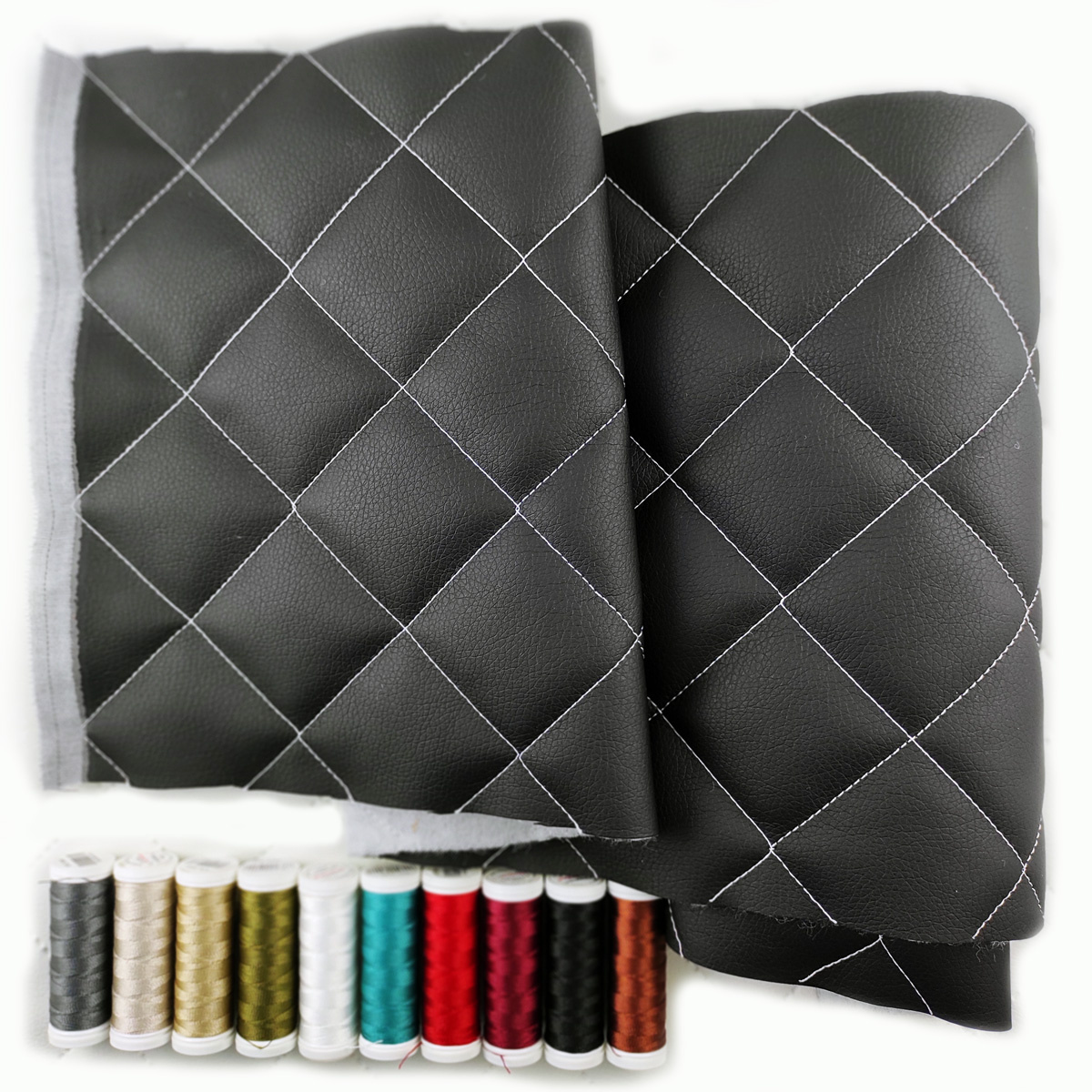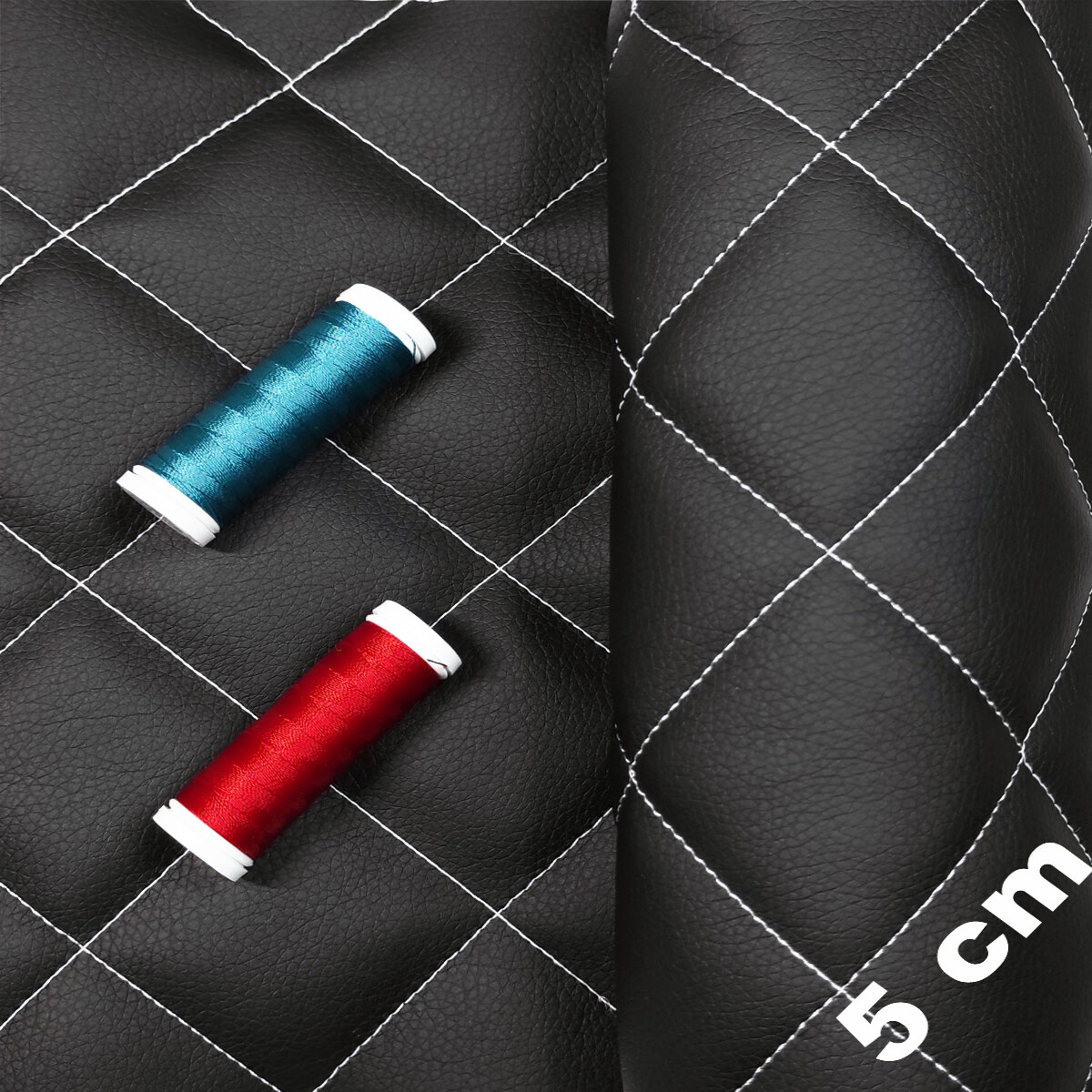Description Simili cuir matelassé 5X5 cm, 540 g/m², largeur 145 cm, noir avec fil blanc