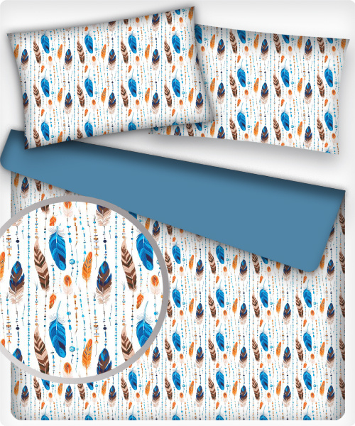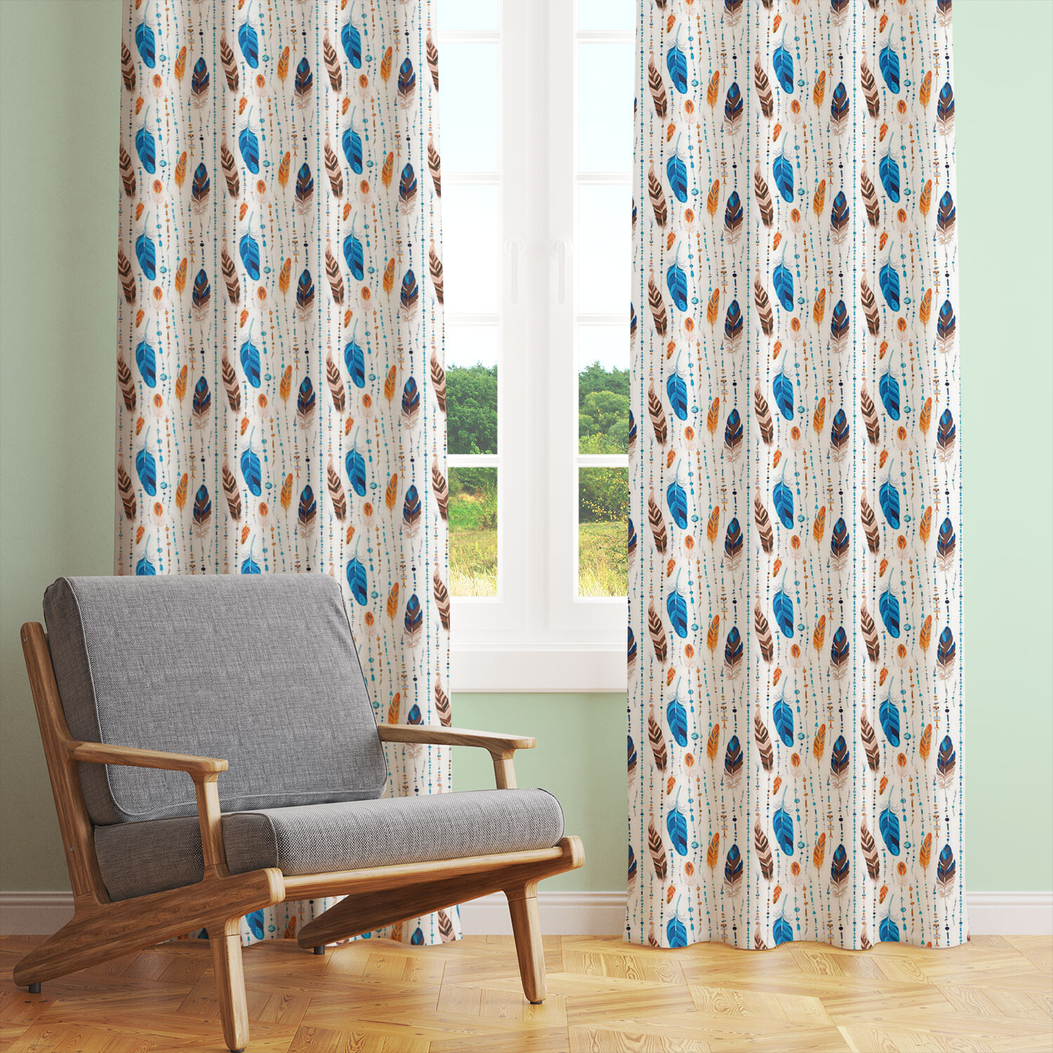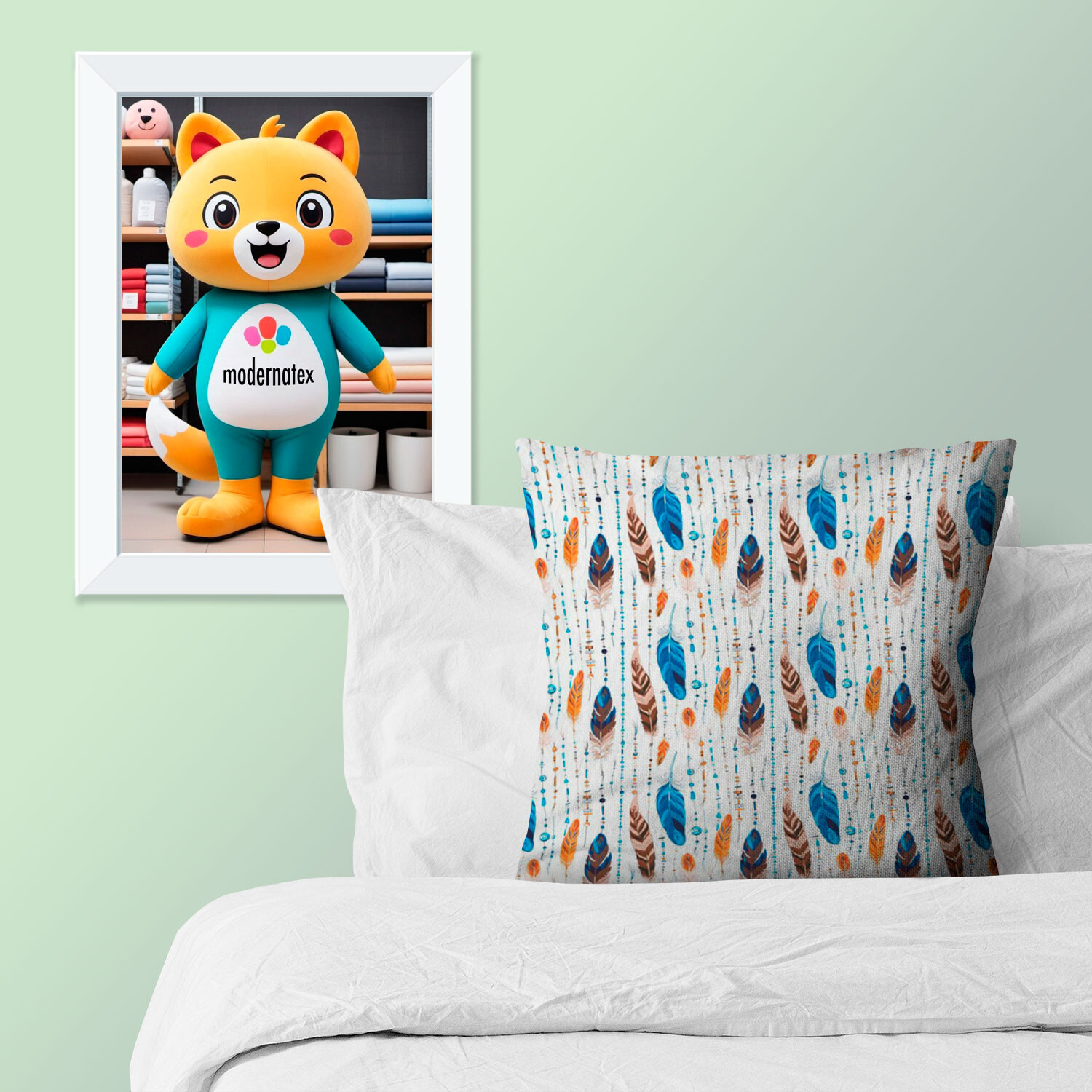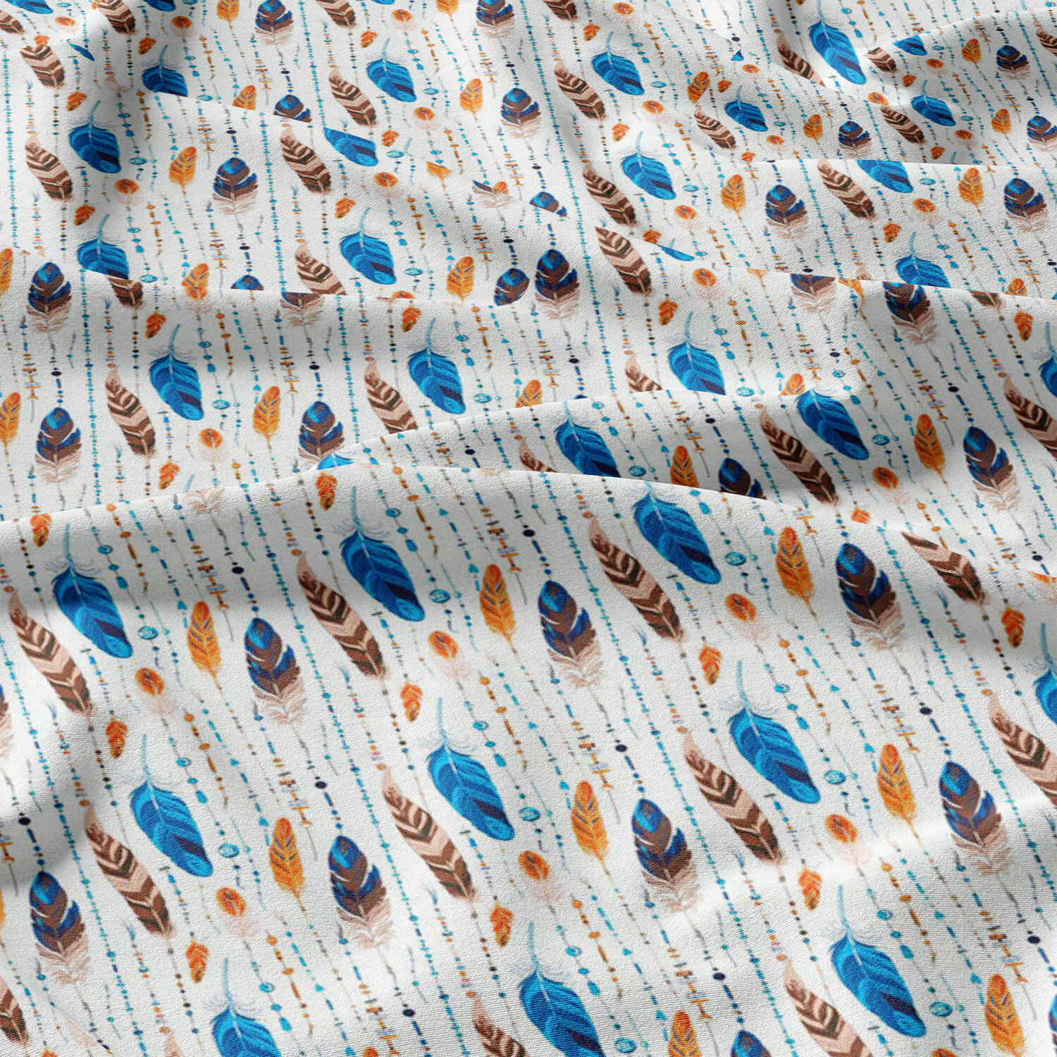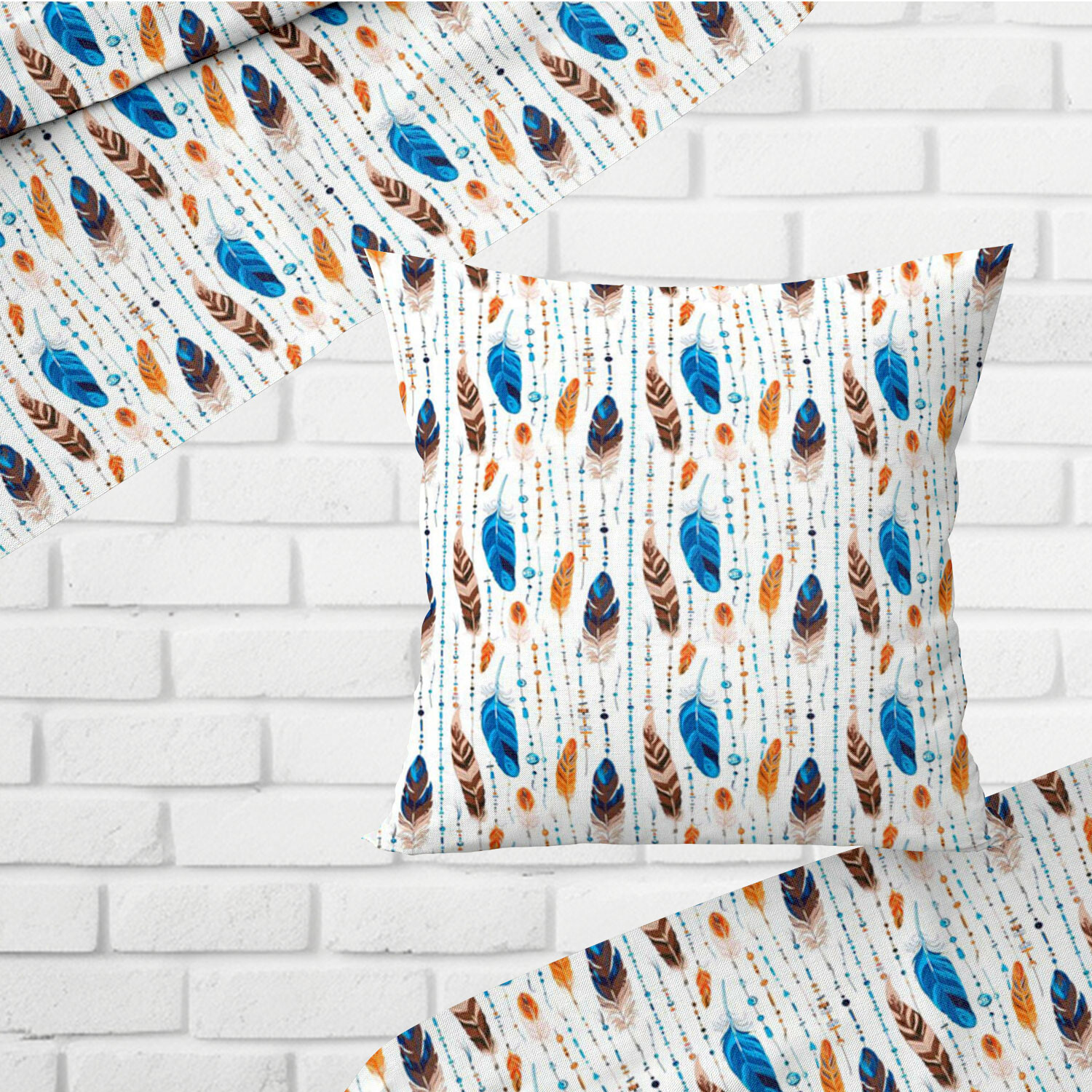 Tissu coton au métre couleur blanche plumes turquoise et jaune