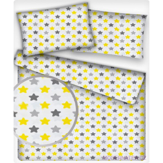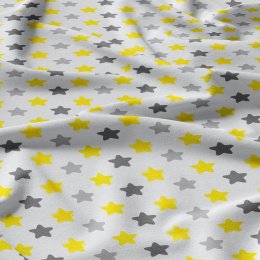 Tissu coton au mètre, 125 g/m², largeur 160 cm, imprimé Etoiles gris, jaune et blanche