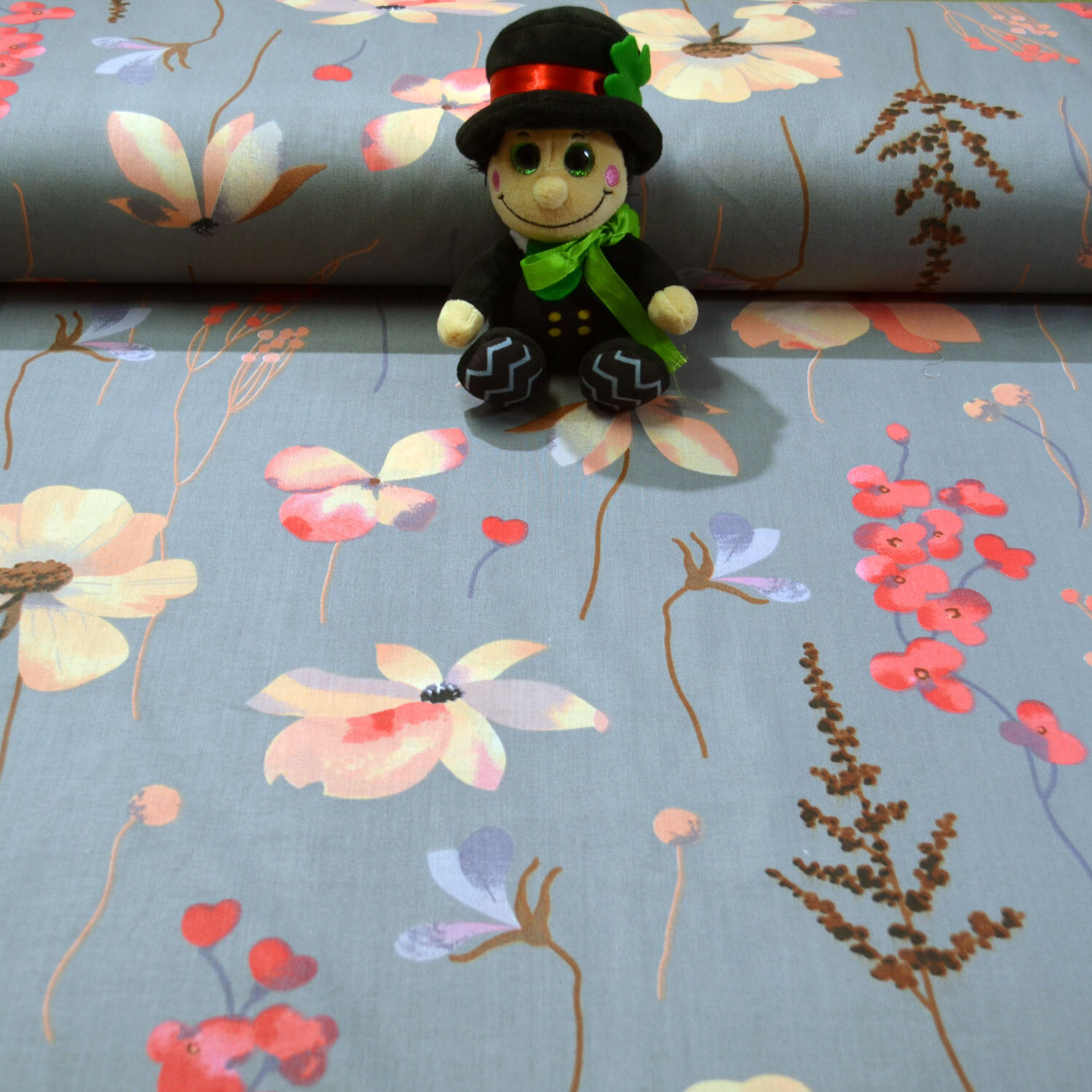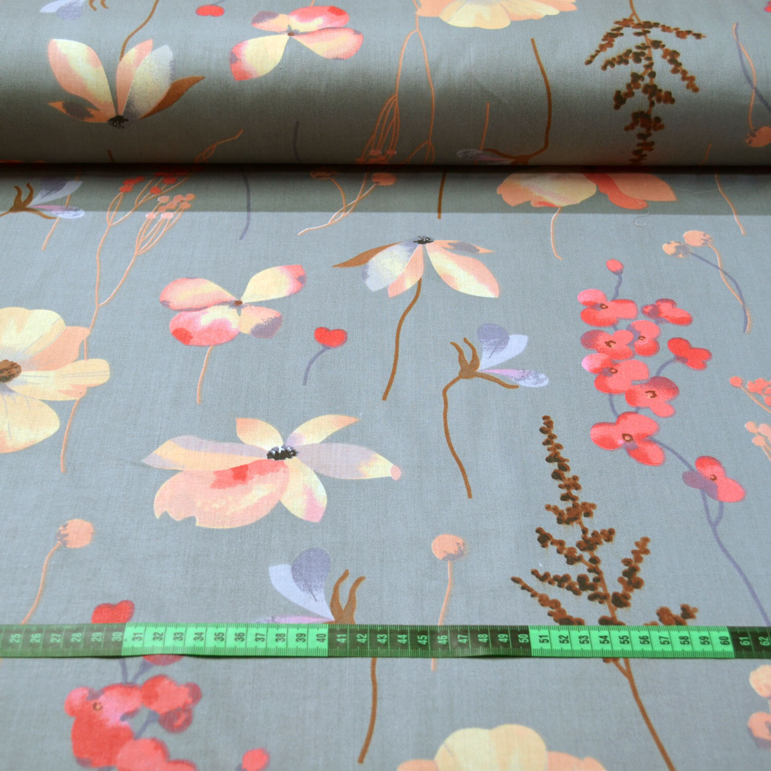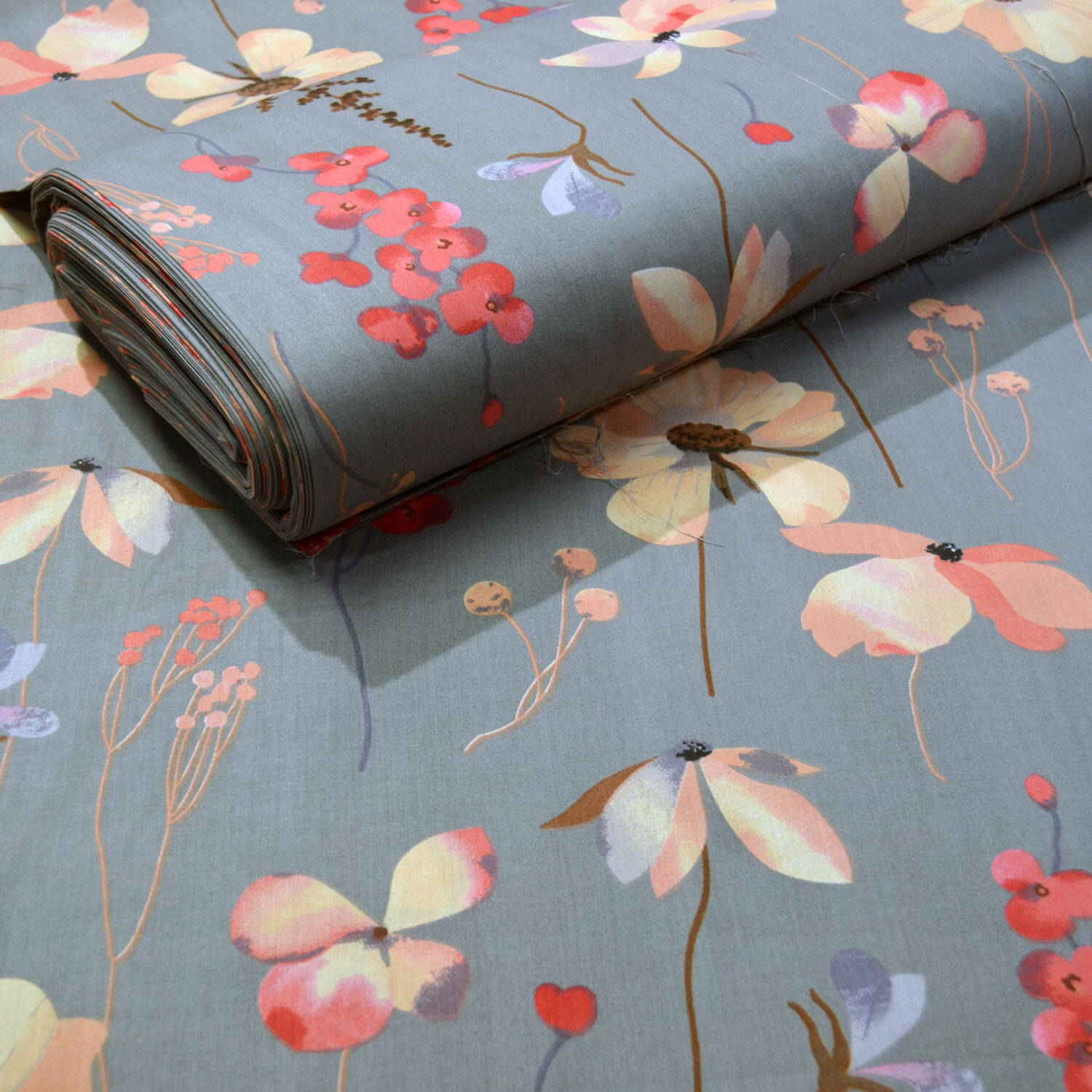 Description Tissu en coton au mètre, 125 g/m², largeur 160 cm, imprimé à fleurs sur fond gris