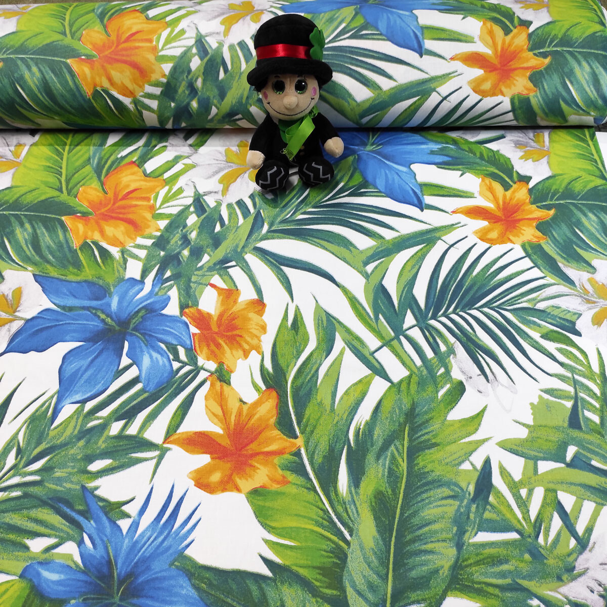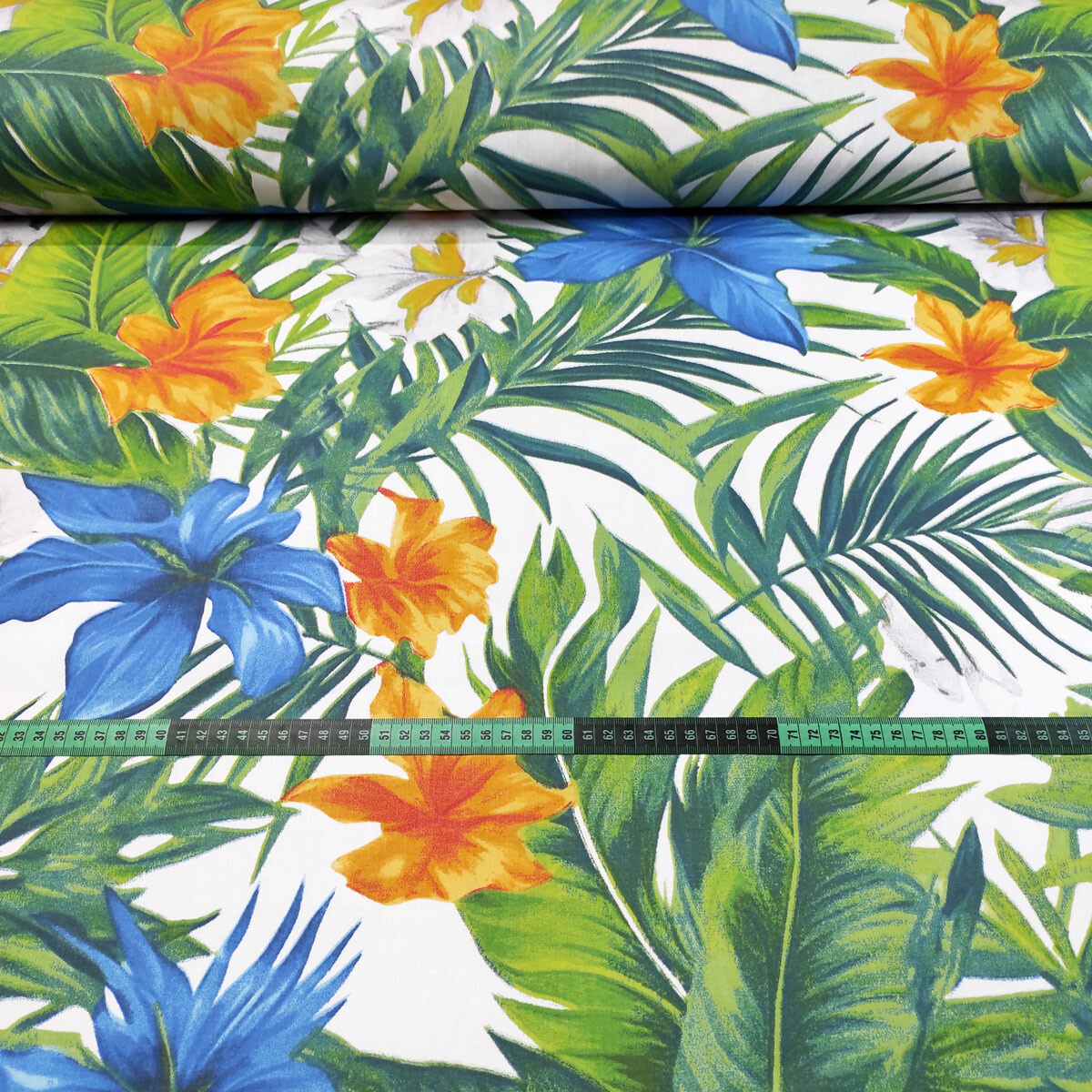 Description Tissu en coton au mètre, 125 g/m², largeur 160 cm, imprimé à jungle verte sur fond blanc