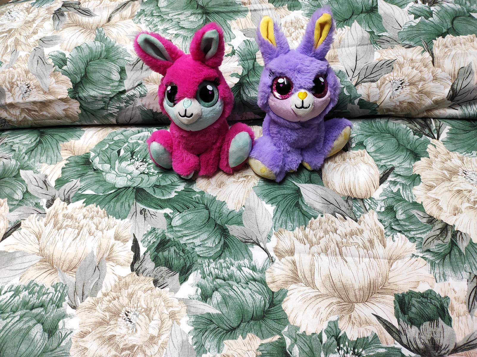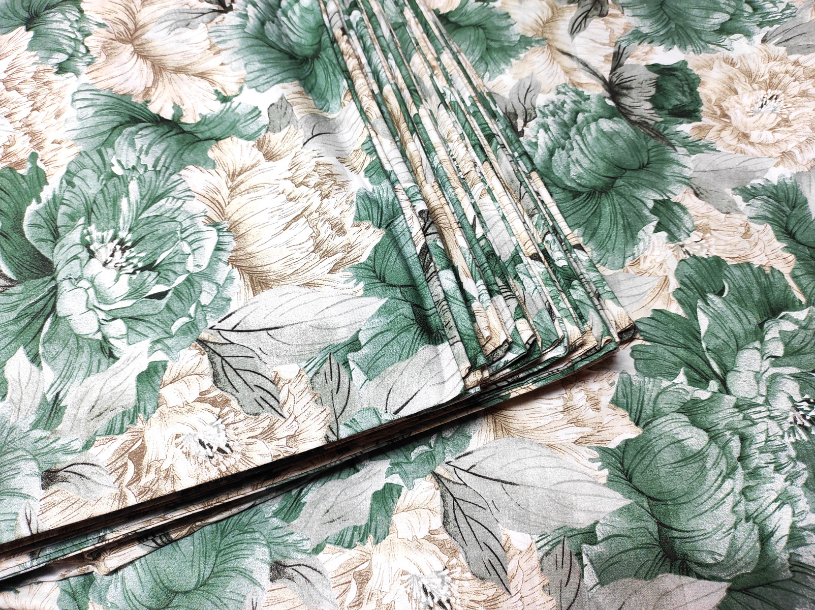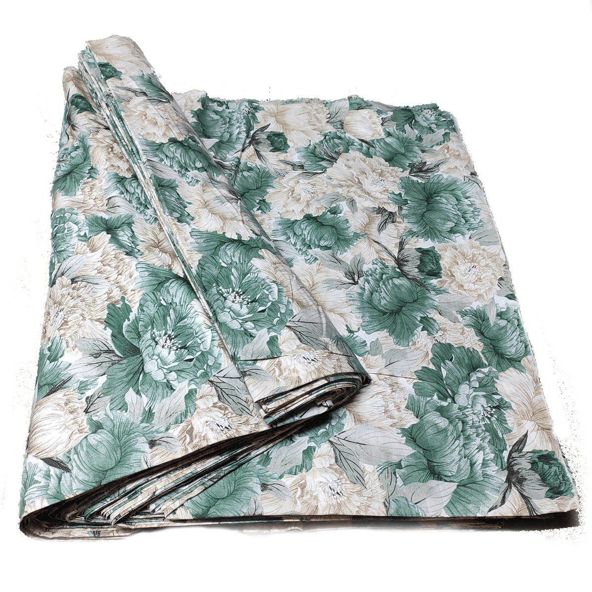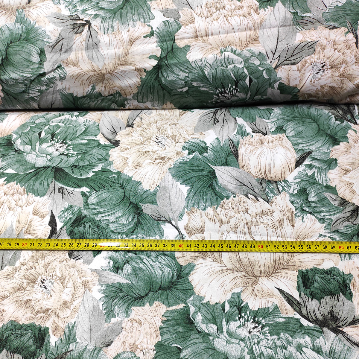 Description Tissu en coton au mètre, 125 g/m², largeur 160 cm, imprimé à pivoine verte vintage sur fond blanc