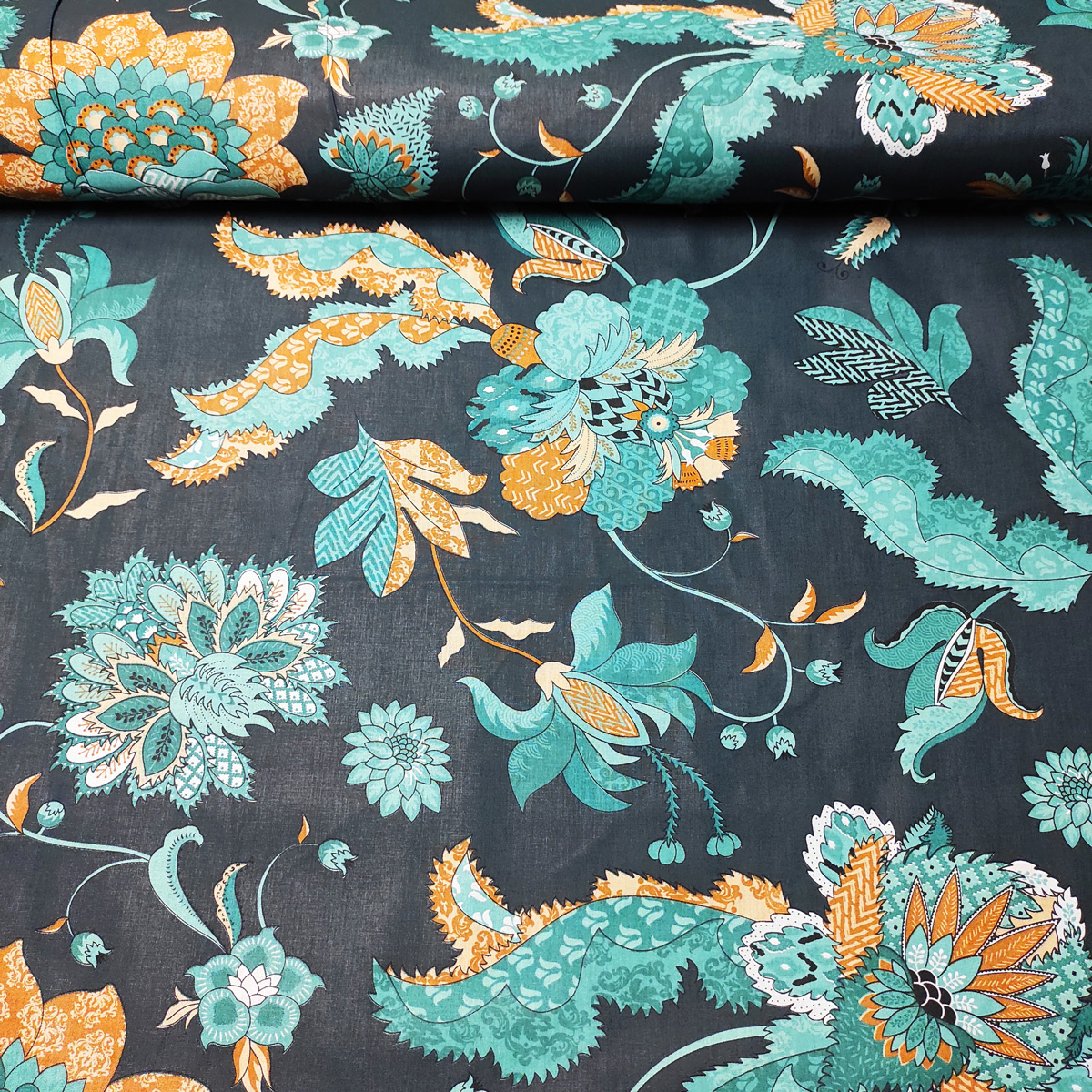 Description Tissu en coton au mètre, 125 g/m², largeur 160 cm, imprimé à pivoine jaune sur fond vert