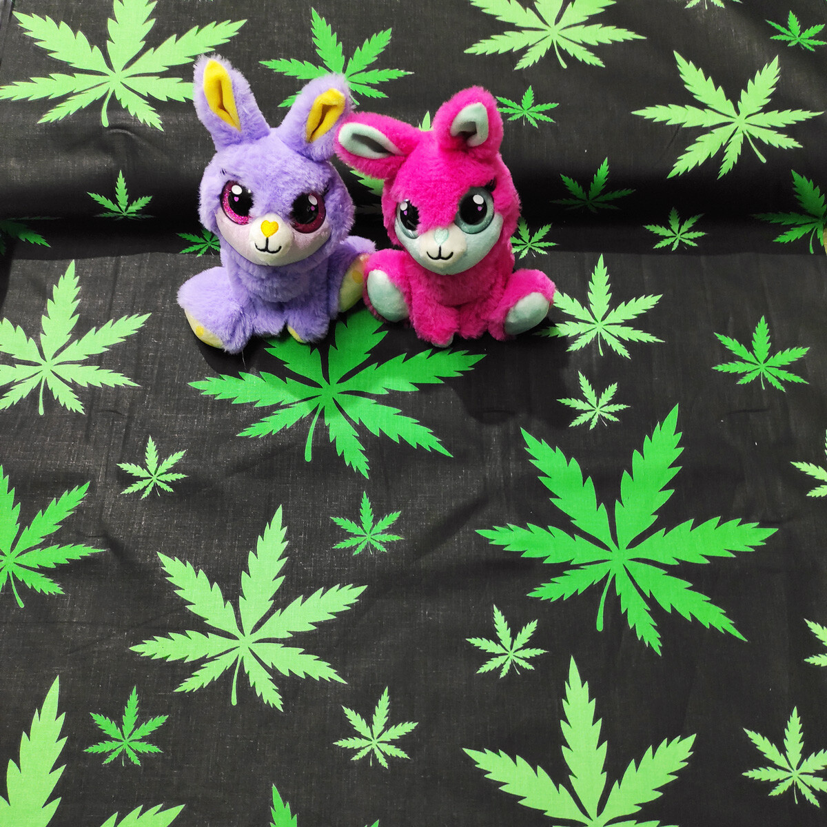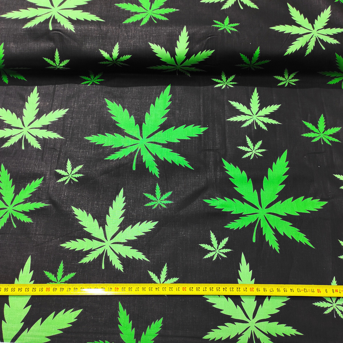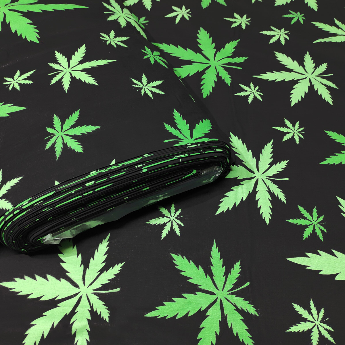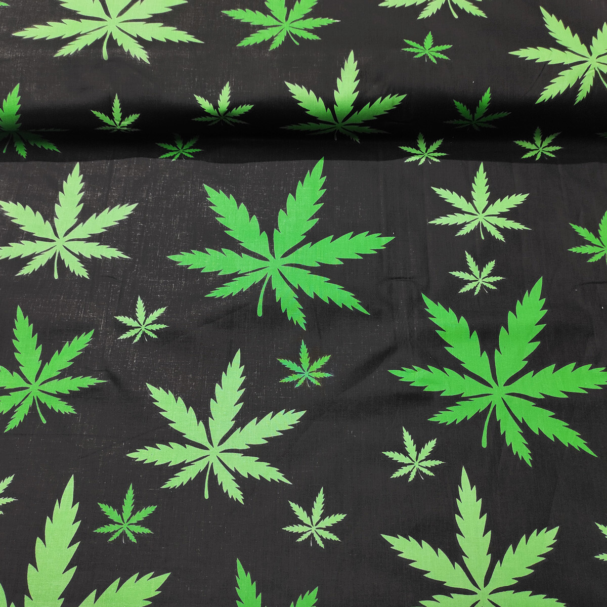 Description Tissu en coton au mètre, 125 g/m², largeur 160 cm, imprimé à feuilles sur fond noir