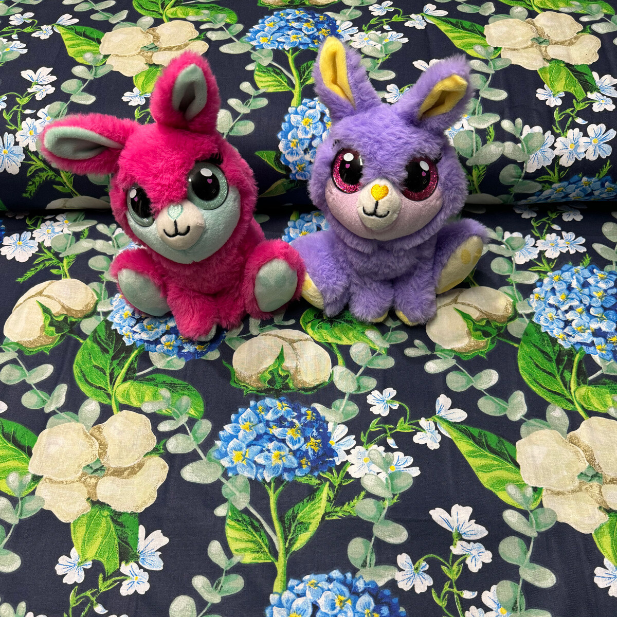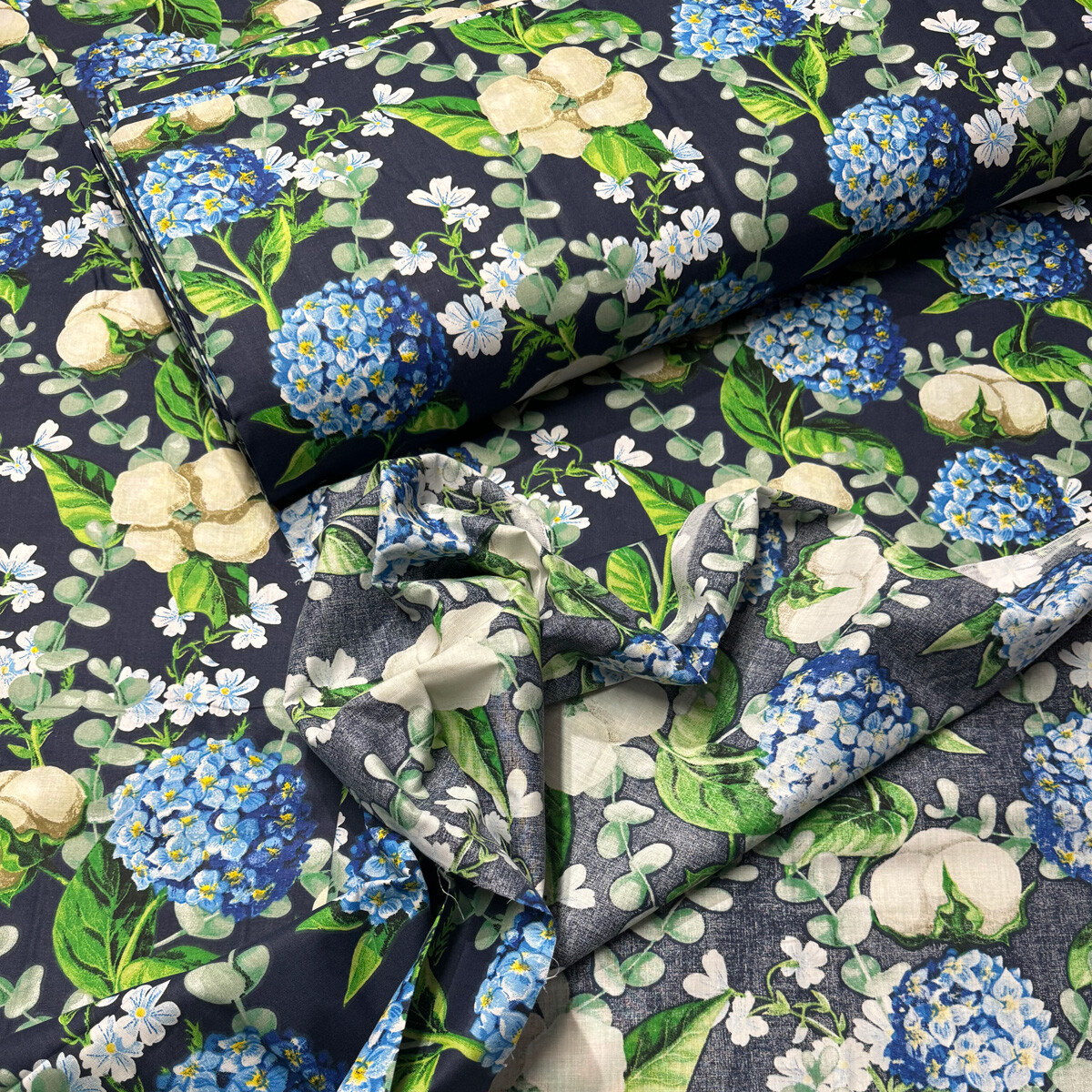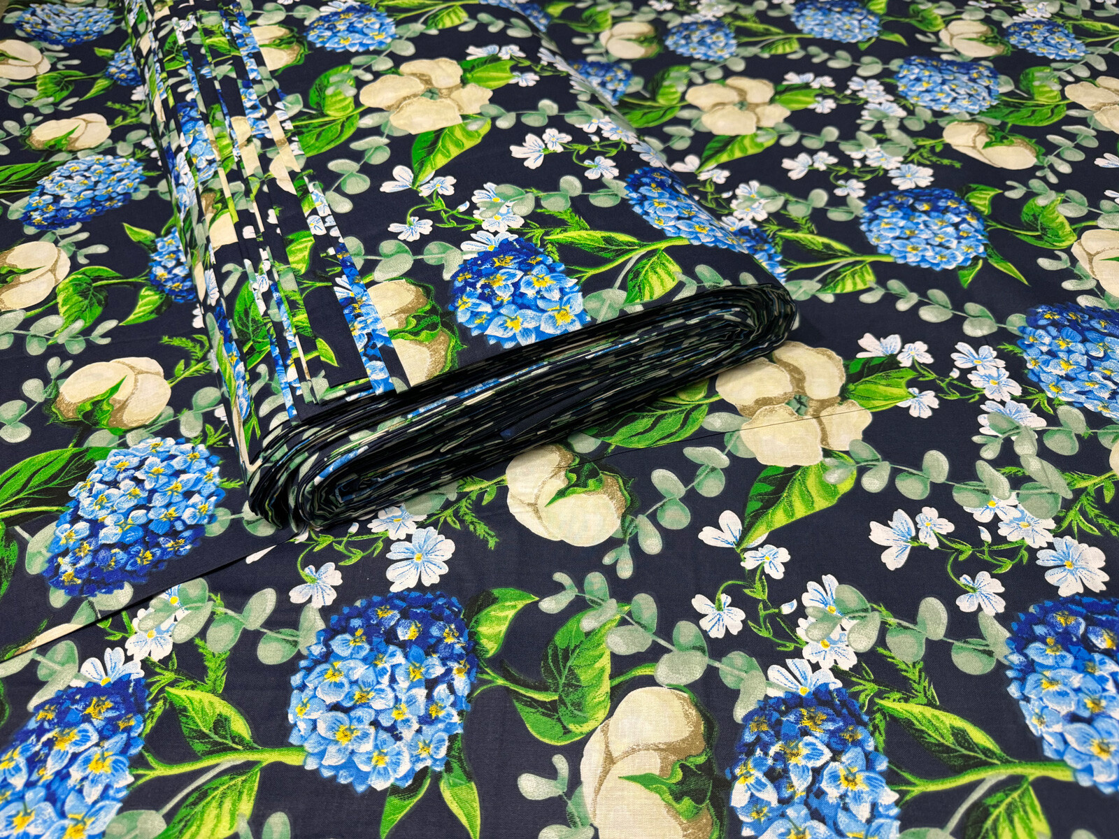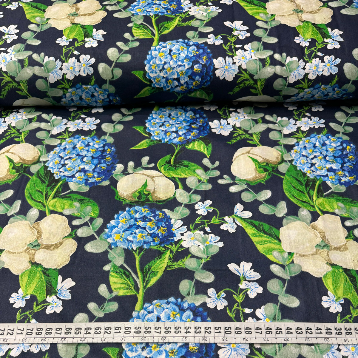 Description Tissu en coton au mètre, 125 g/m², largeur 160 cm, imprimé à fleurs bleues marine
