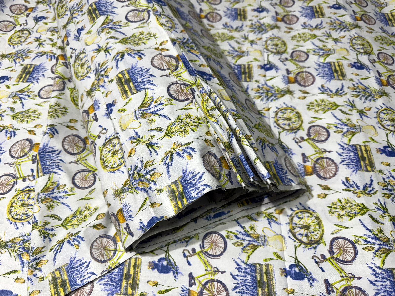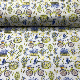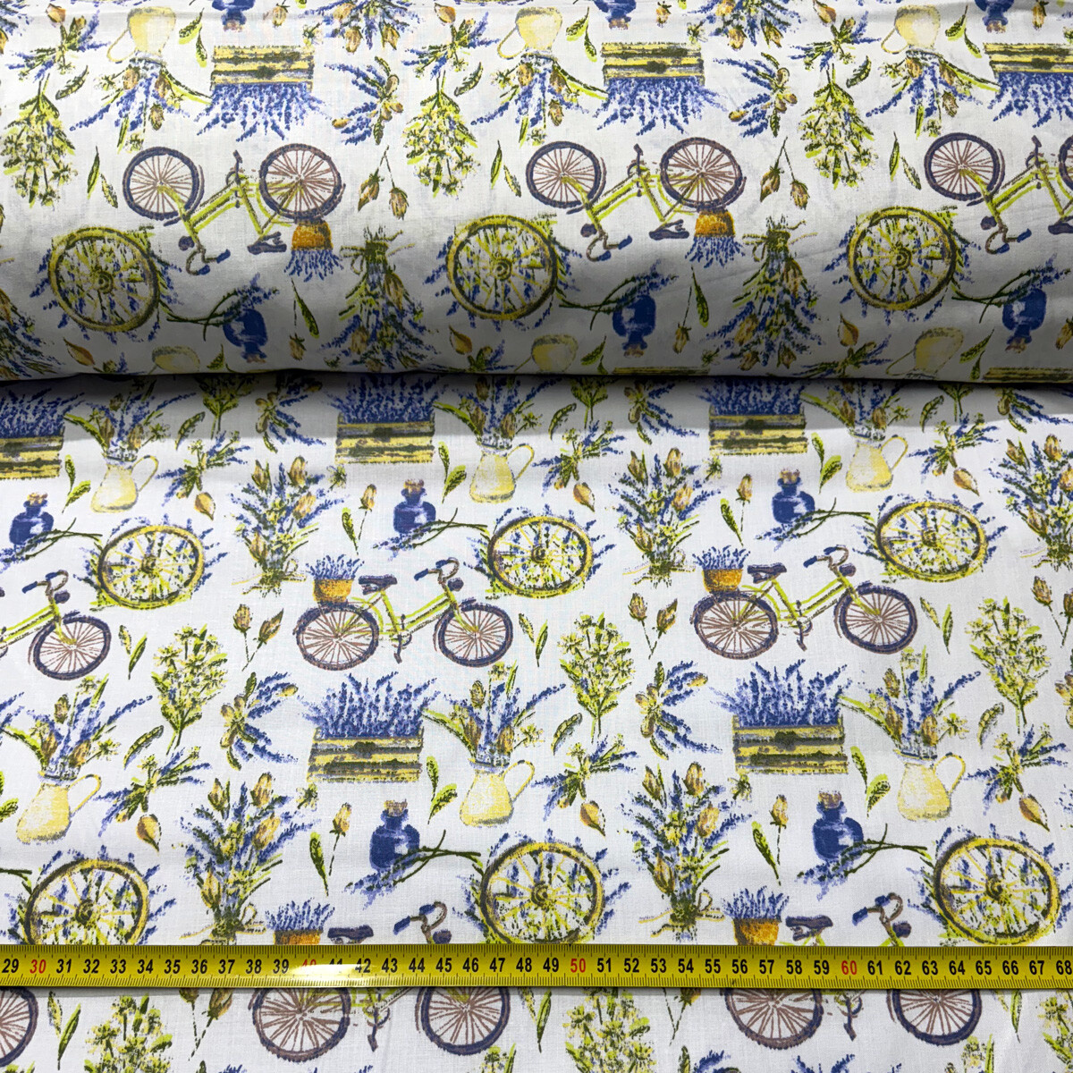 Description Tissu en coton au mètre, 125 g/m², largeur 160 cm, imprimé à fleurs et vélo sur fond blanc
