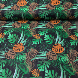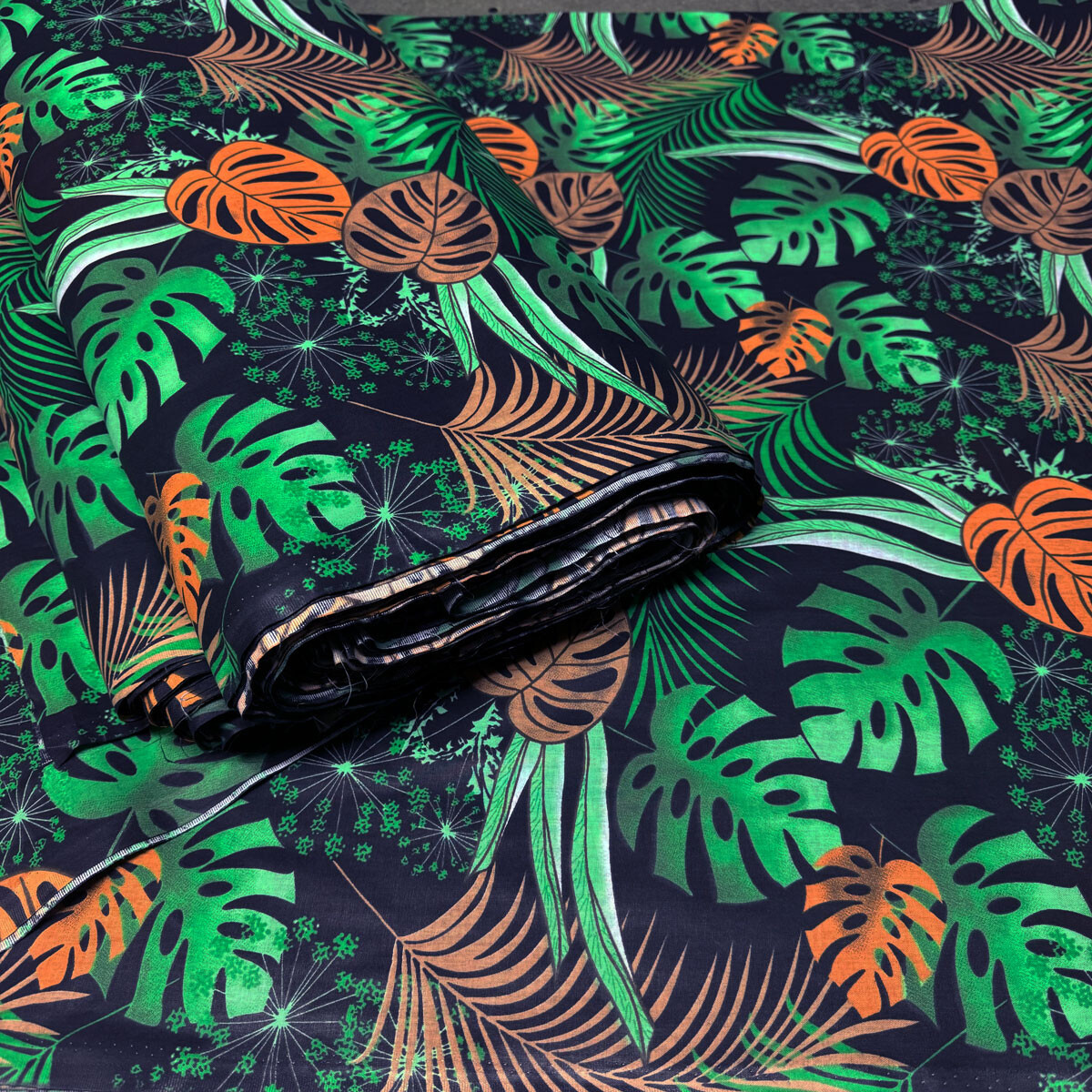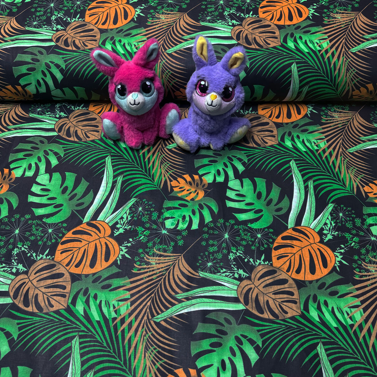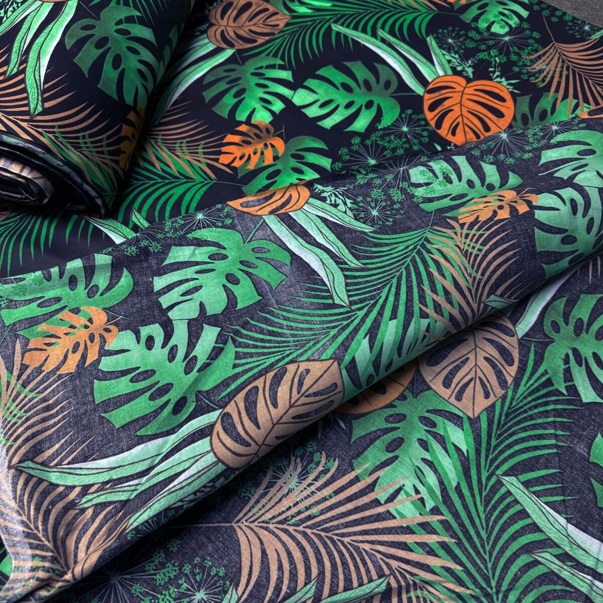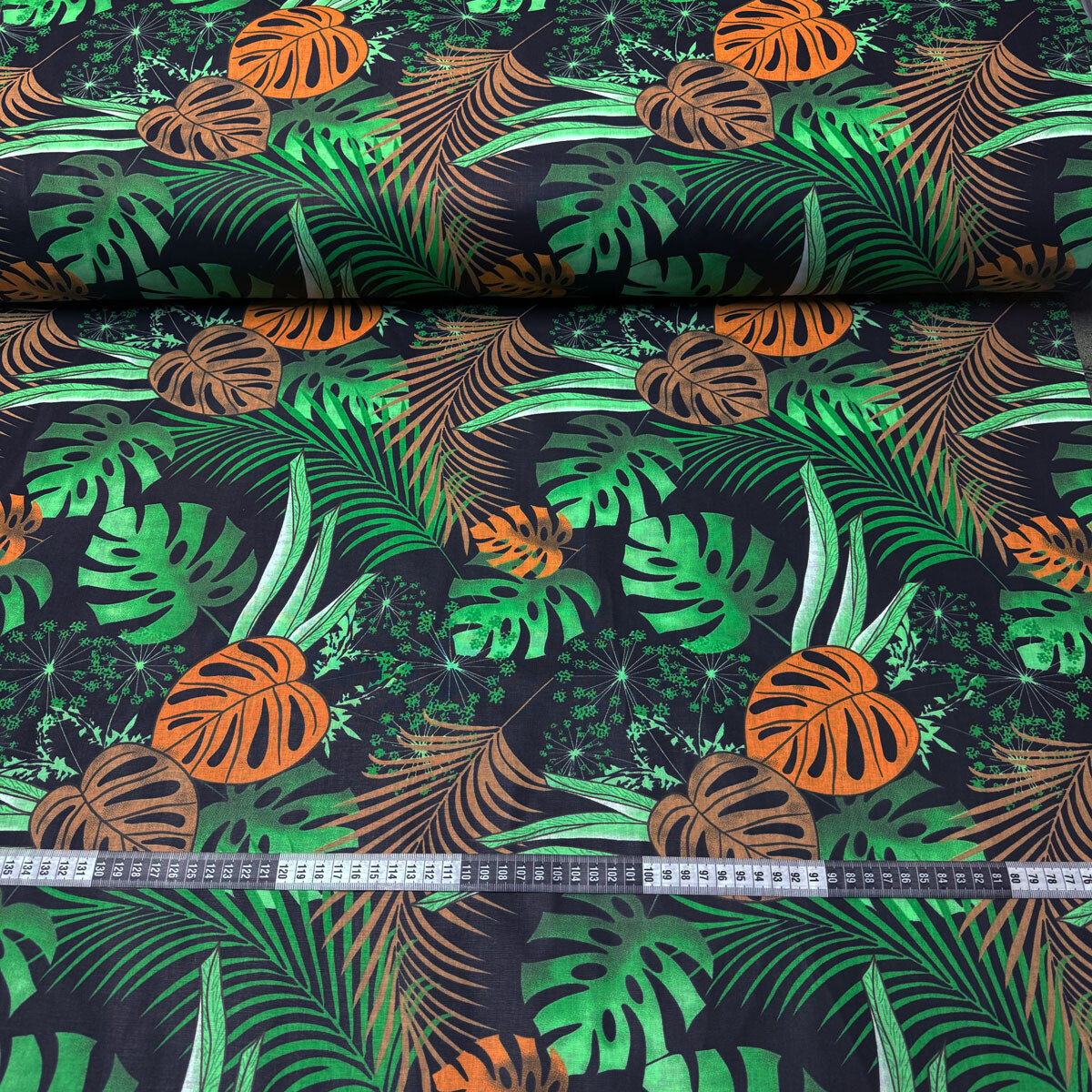 Description Tissu en coton au mètre, 125 g/m², largeur 160 cm, imprimé à palma sur fond noir