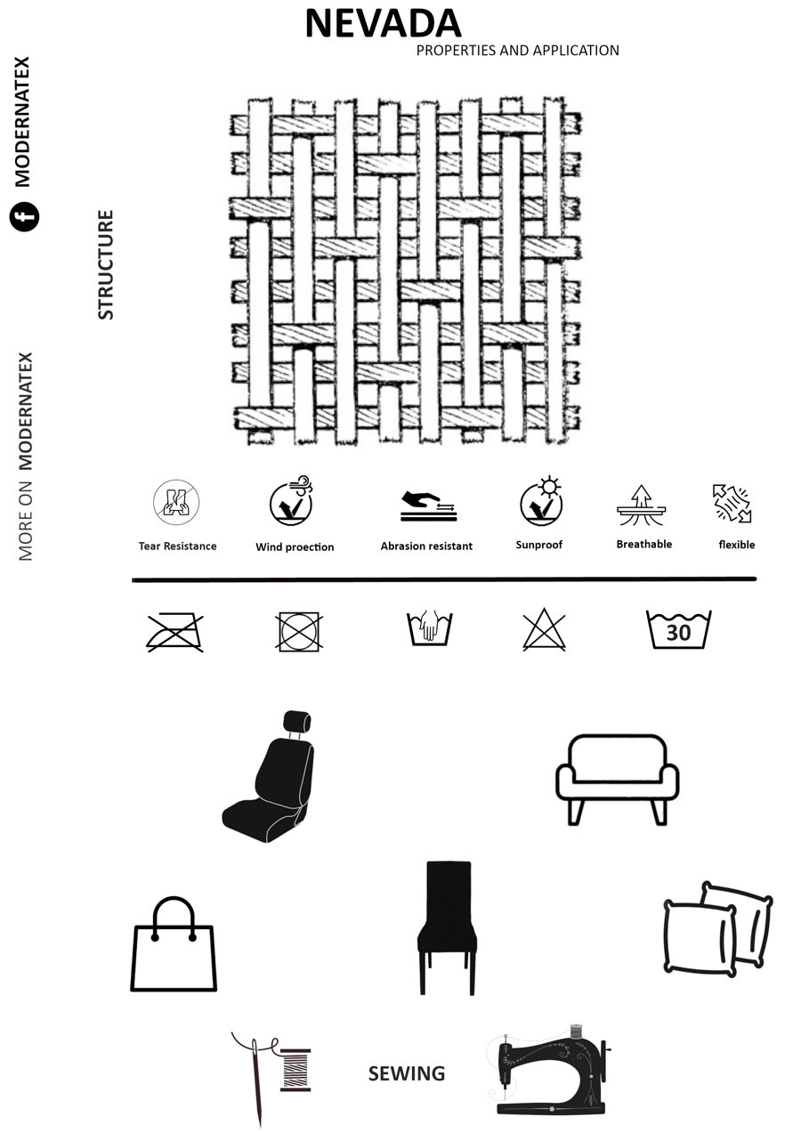 Le tissu d’ameublement Nevada est un textile polyvalent, conçu pour la confection de housses, coussins d’assise, dossiers de chaises, sacs et autres éléments de décoration intérieure. Grâce à sa structure dense et légèrement extensible, il offre une excellente résistance à l’usure tout en restant doux, souple et facile à coudre, même avec une machine domestique.