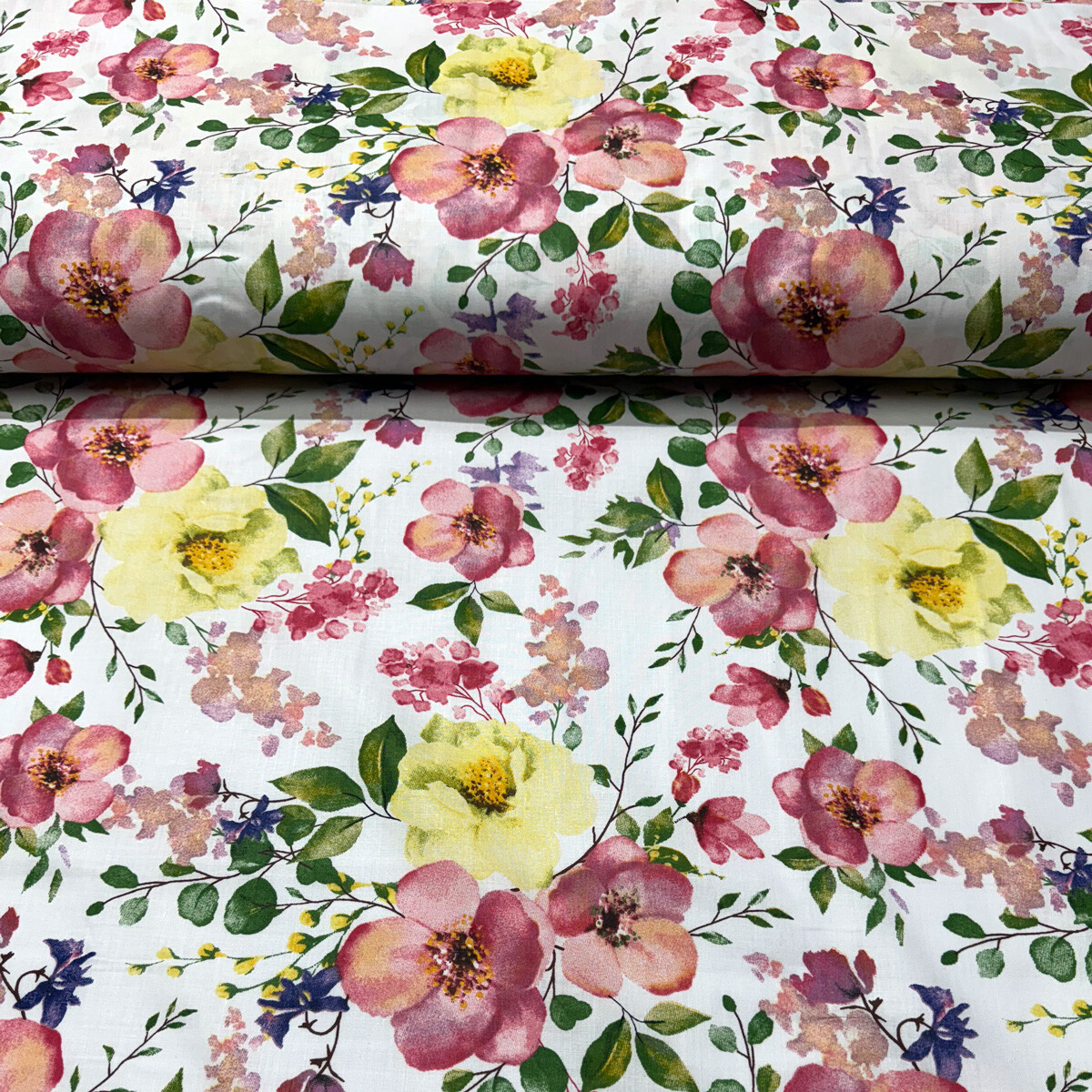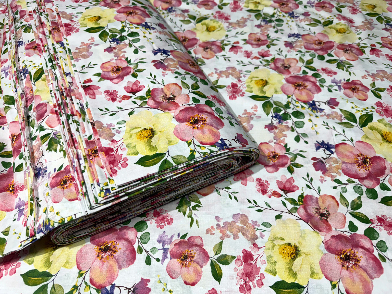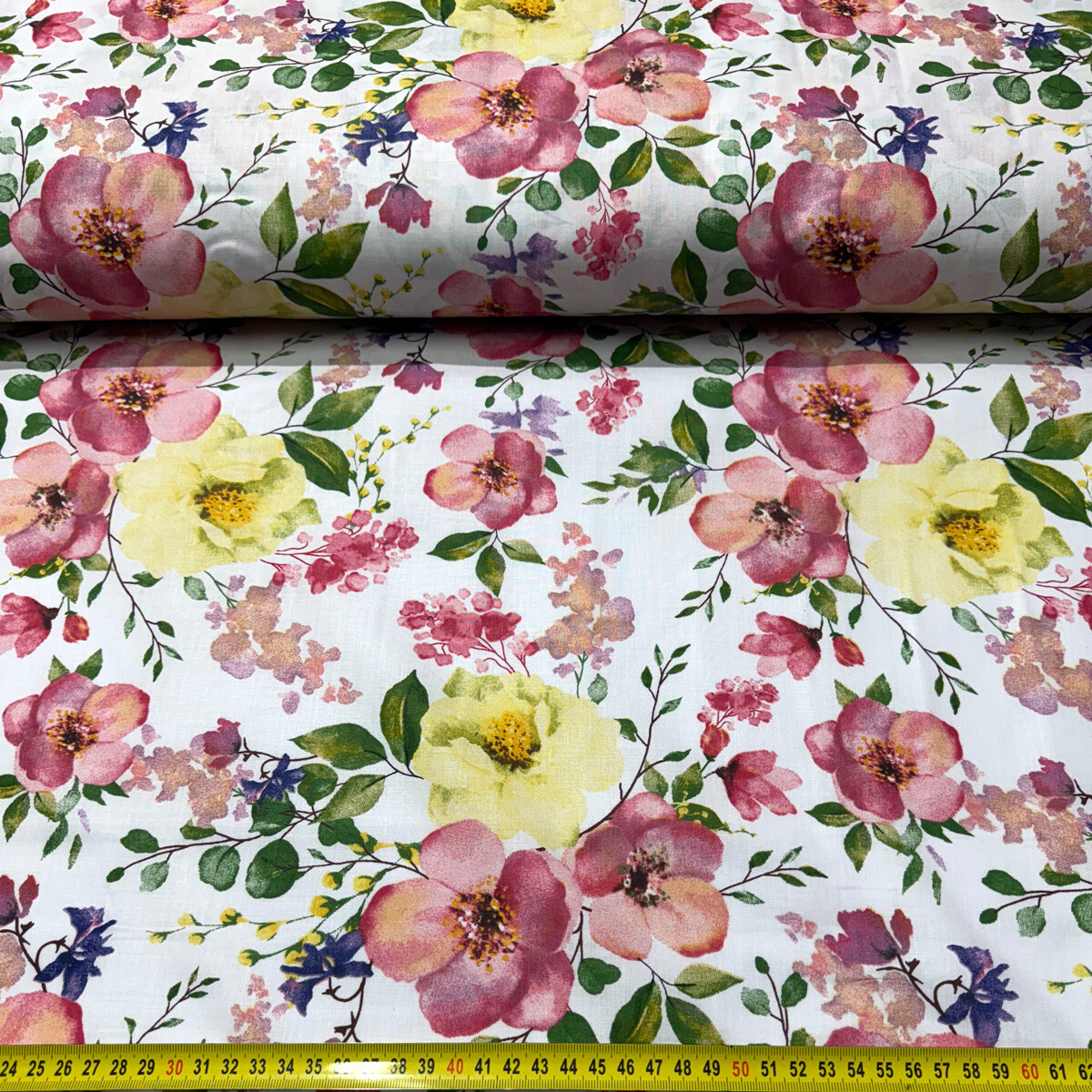 Description Tissu en coton au mètre, 125 g/m², largeur 160 cm, imprimé à pommier sur fond blanc