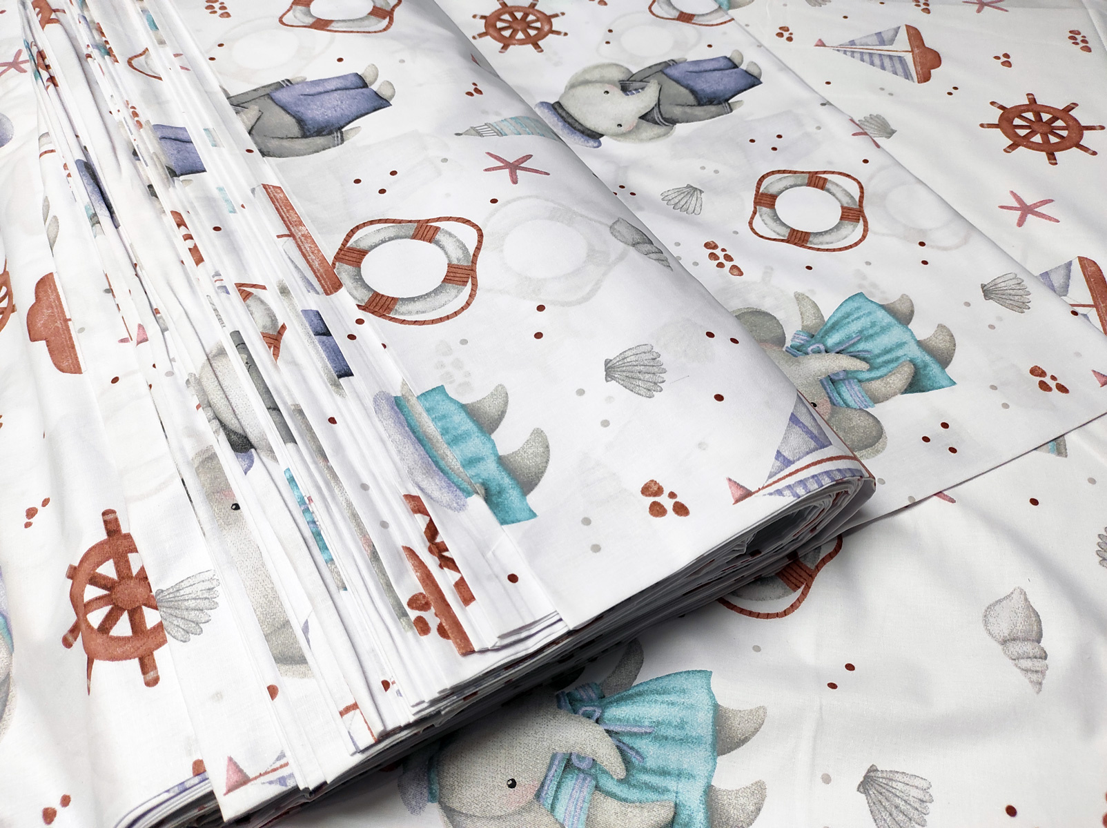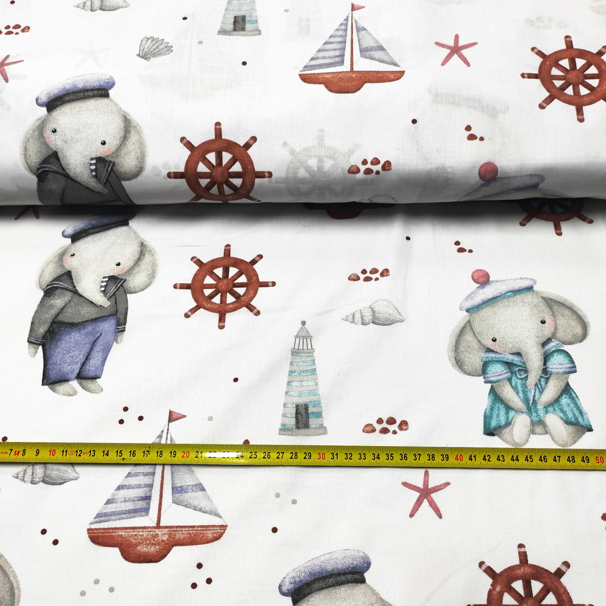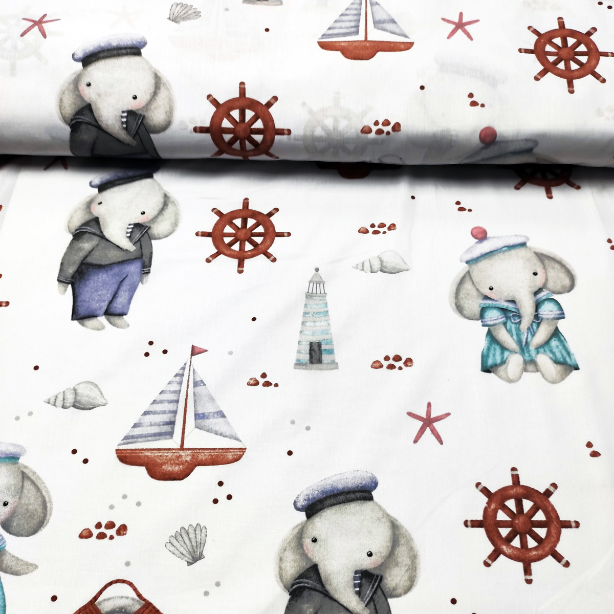 Description Tissu en coton motif éléphants et gouvernail sur blanc 690