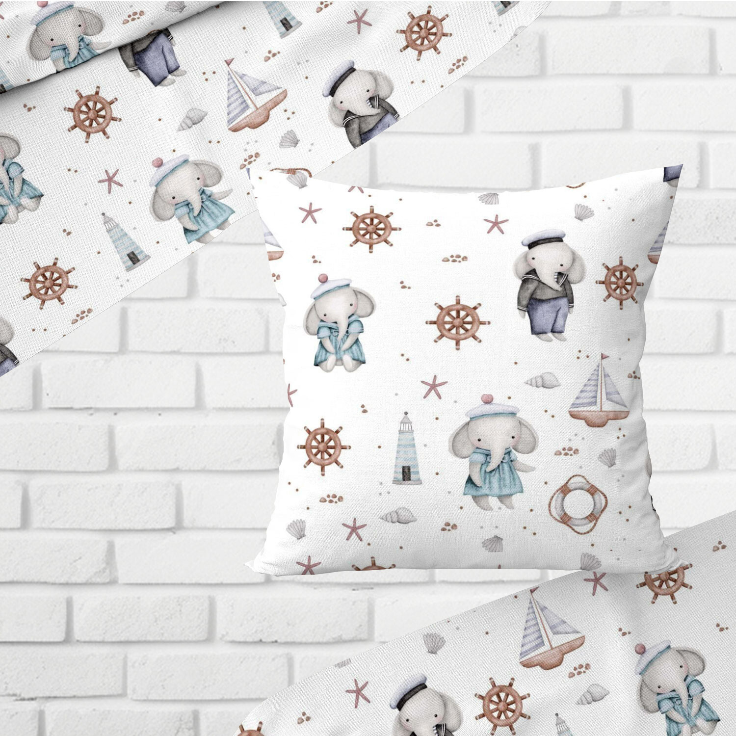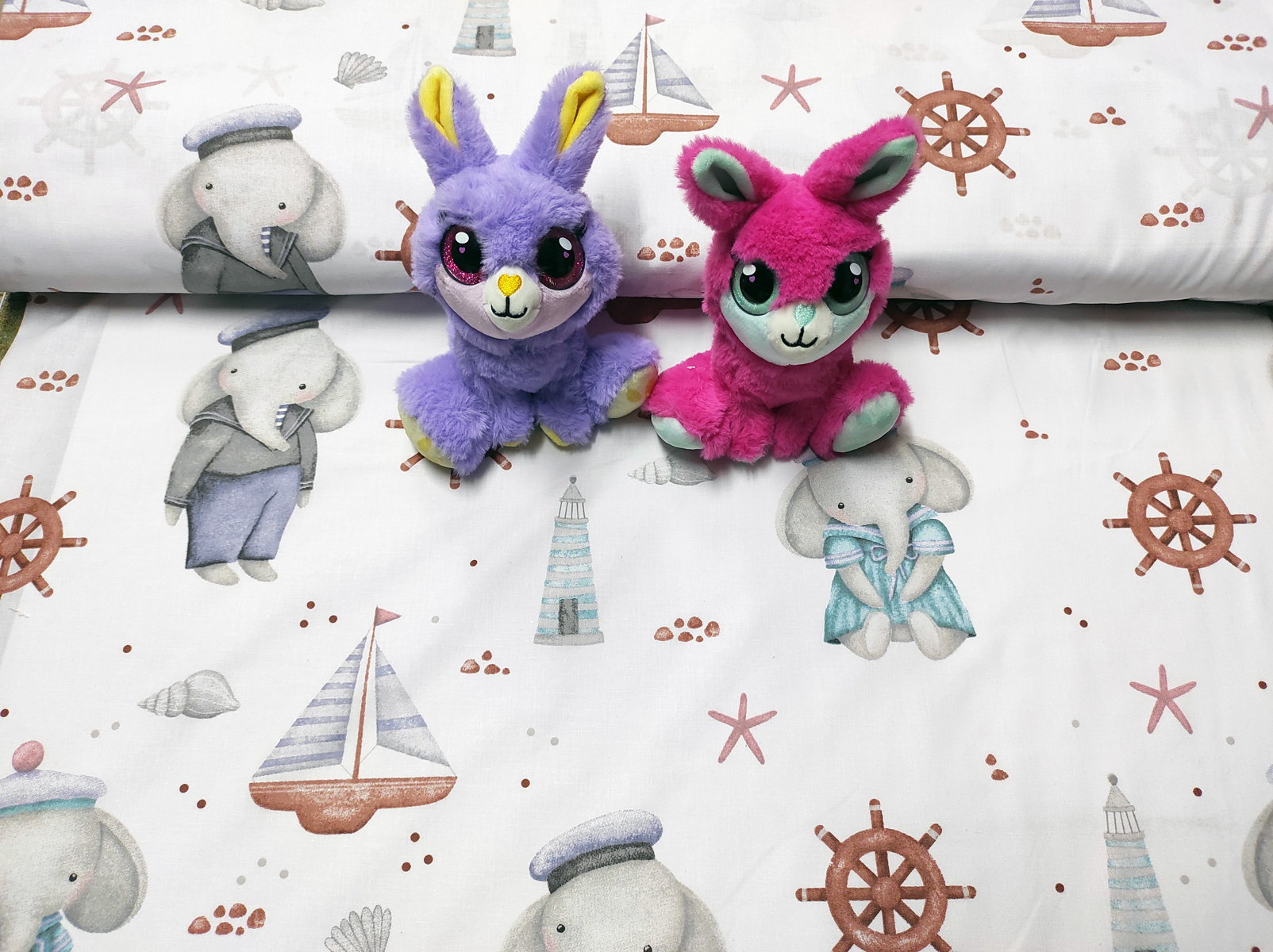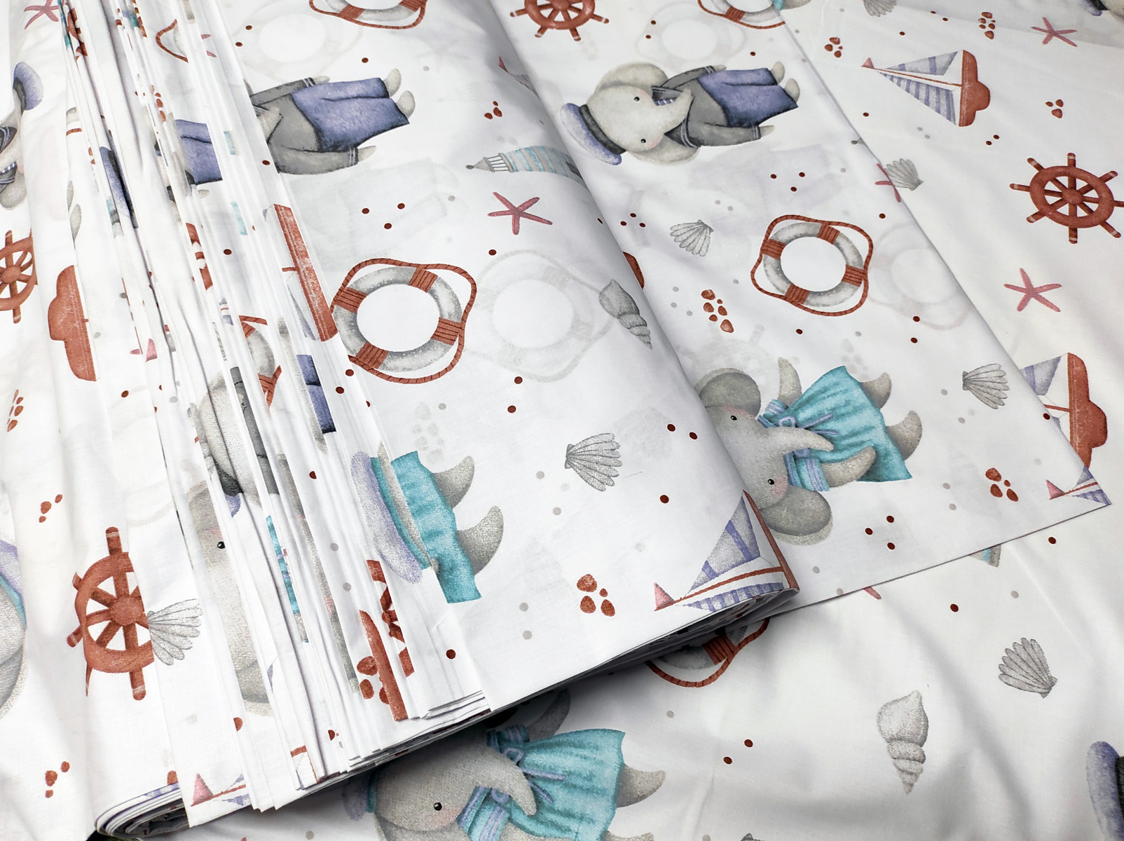 Description Tissu en coton motif éléphants et gouvernail sur blanc 690