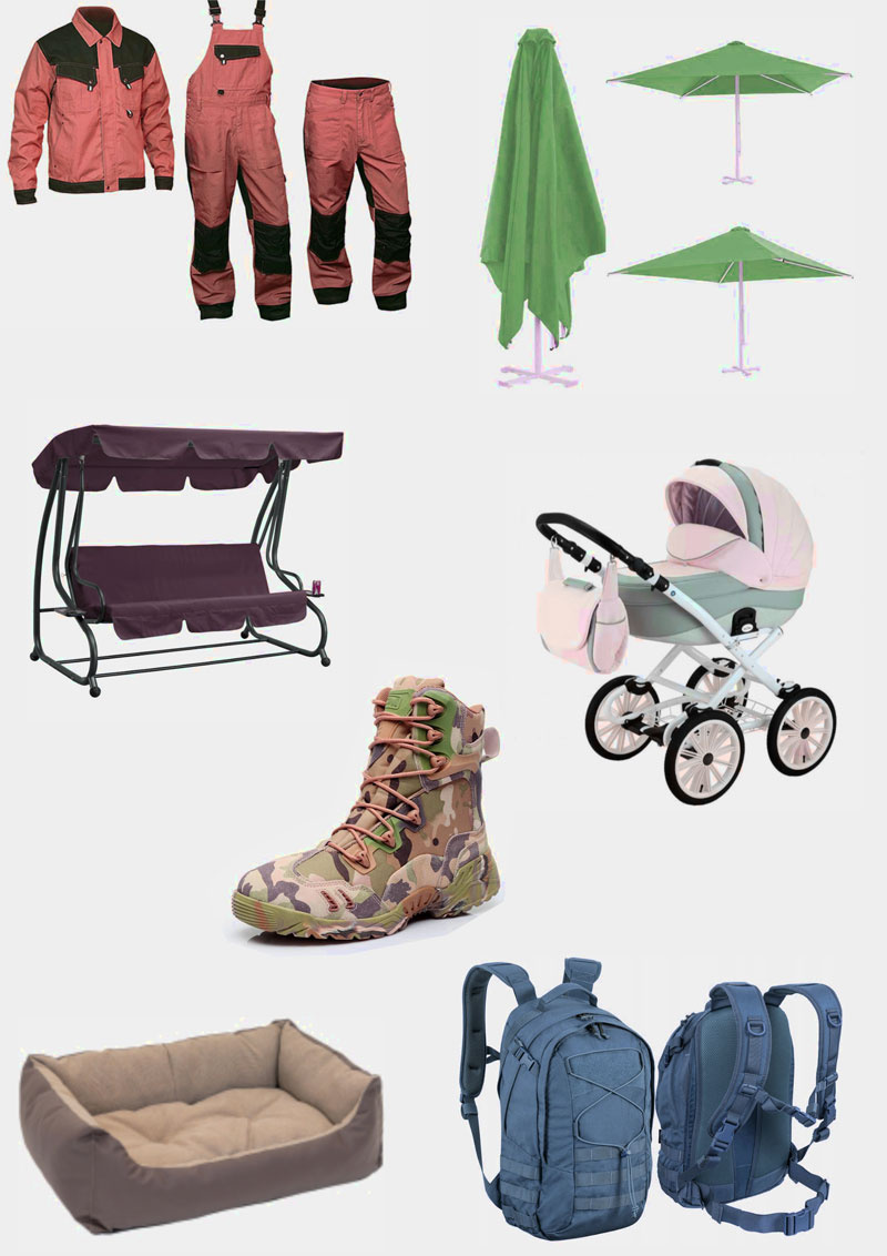 pour la production de sacs à dos, sacs publicitaires et protections, vêtements de plein air et professionnels, parasols, auvents, housses de poussettes et pour la production de sacs de voyage et valises